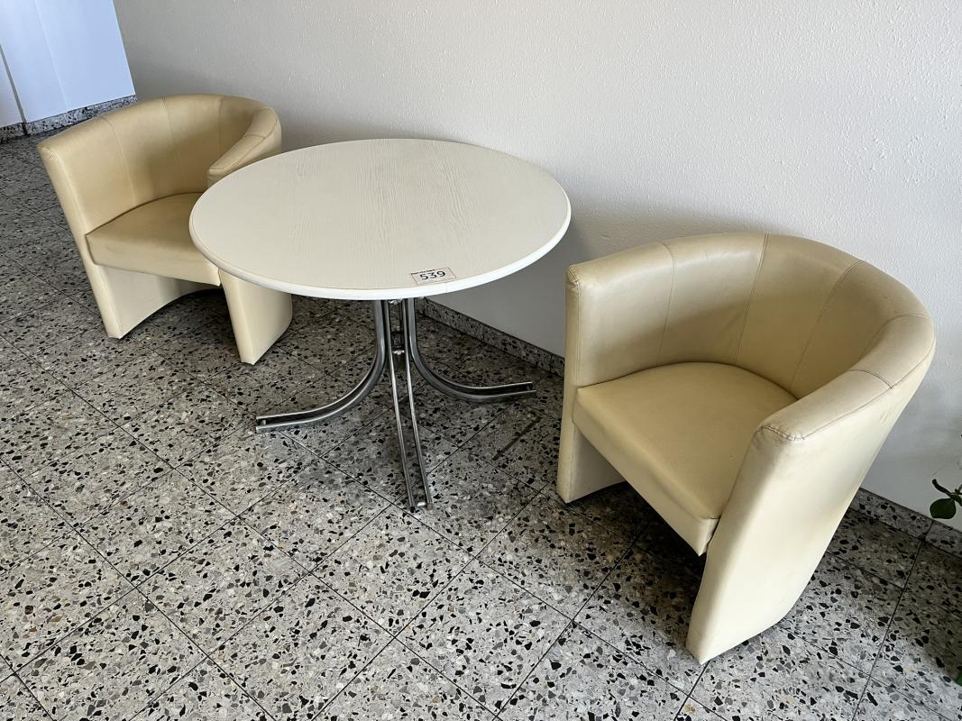 Ø 1.000 mm, Metalluntergestell, Holzplattenauflage, 2 Ledersessel, beige