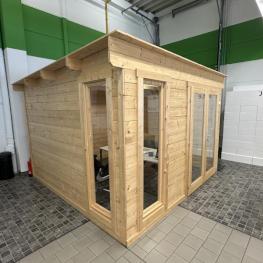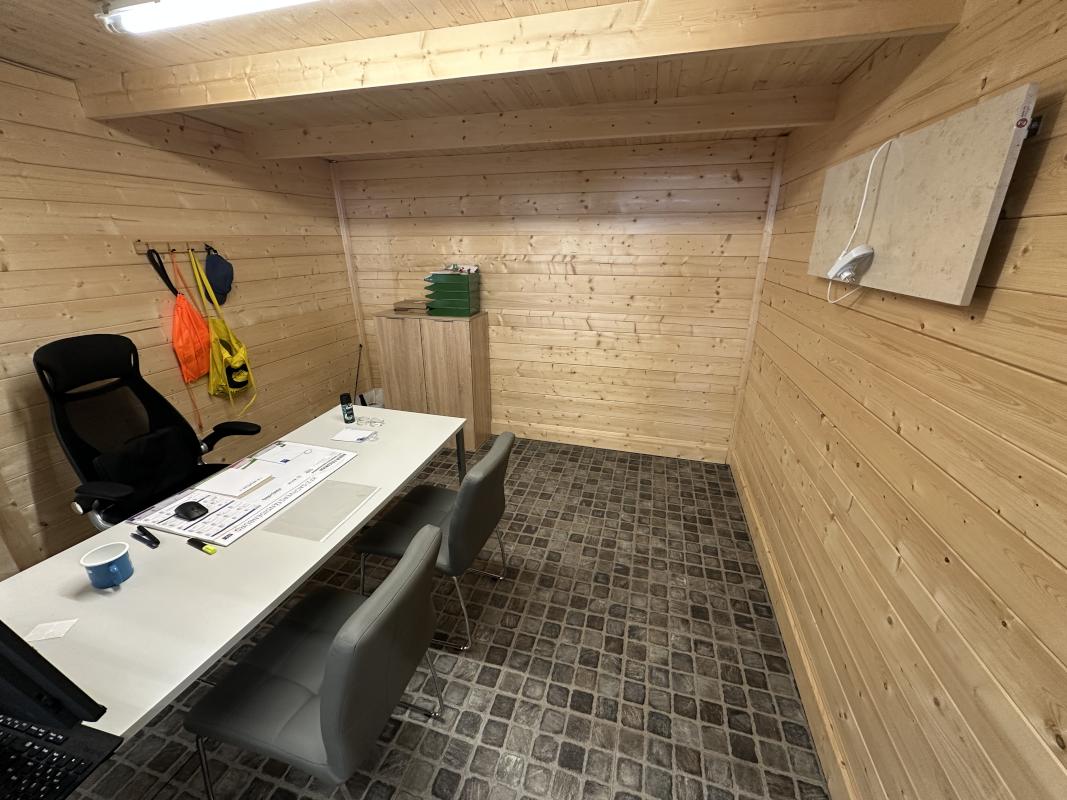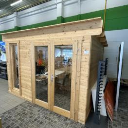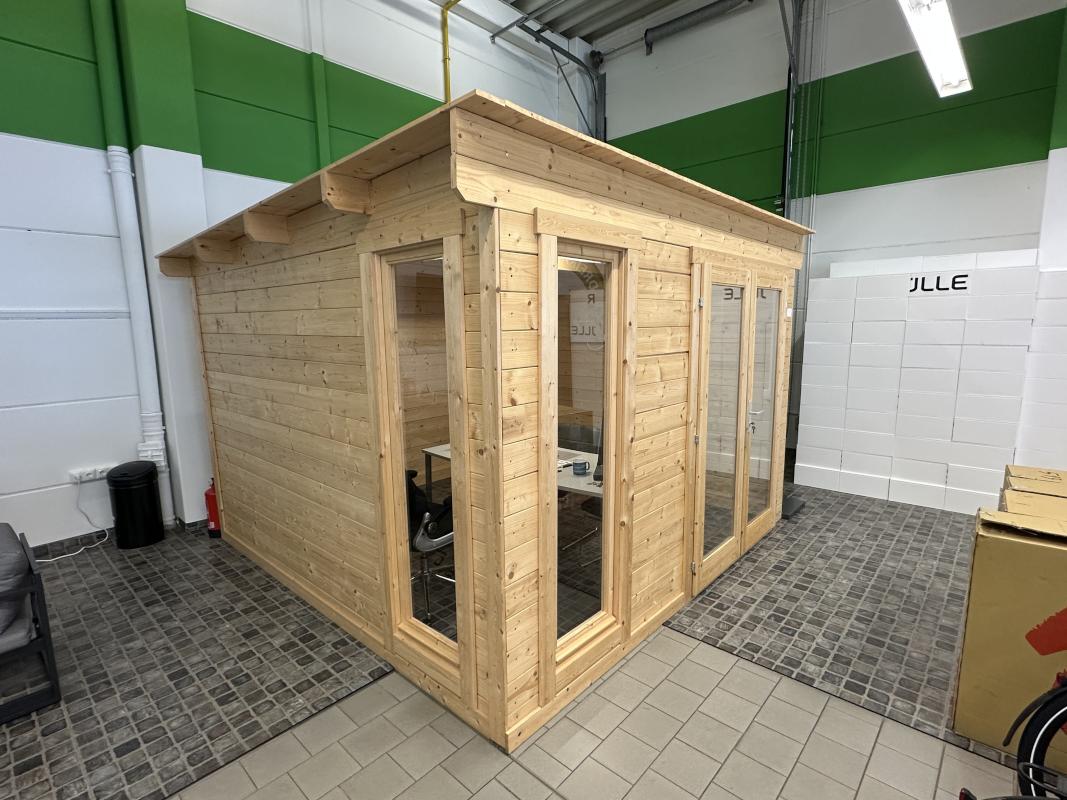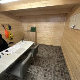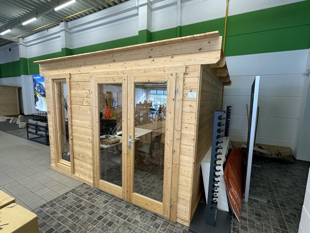 Fabrikat: GARTENHAUS, Typ: Aldo-28A, Baujahr: 2022, 13.54 m², Flachdach, Maße ca. 3.200x3.200x 2.300 mm, 2 Glaselemente, Eingangstür verglast, Inhalt: Schreibtisch, Bürodrehstuhl schwarz, 2 Stühle Chromuntergestell, Kunstleder grau, Highboard, 2 Flügeltüren, Eiche hell, Natursteinheizplatte Wandanbringung