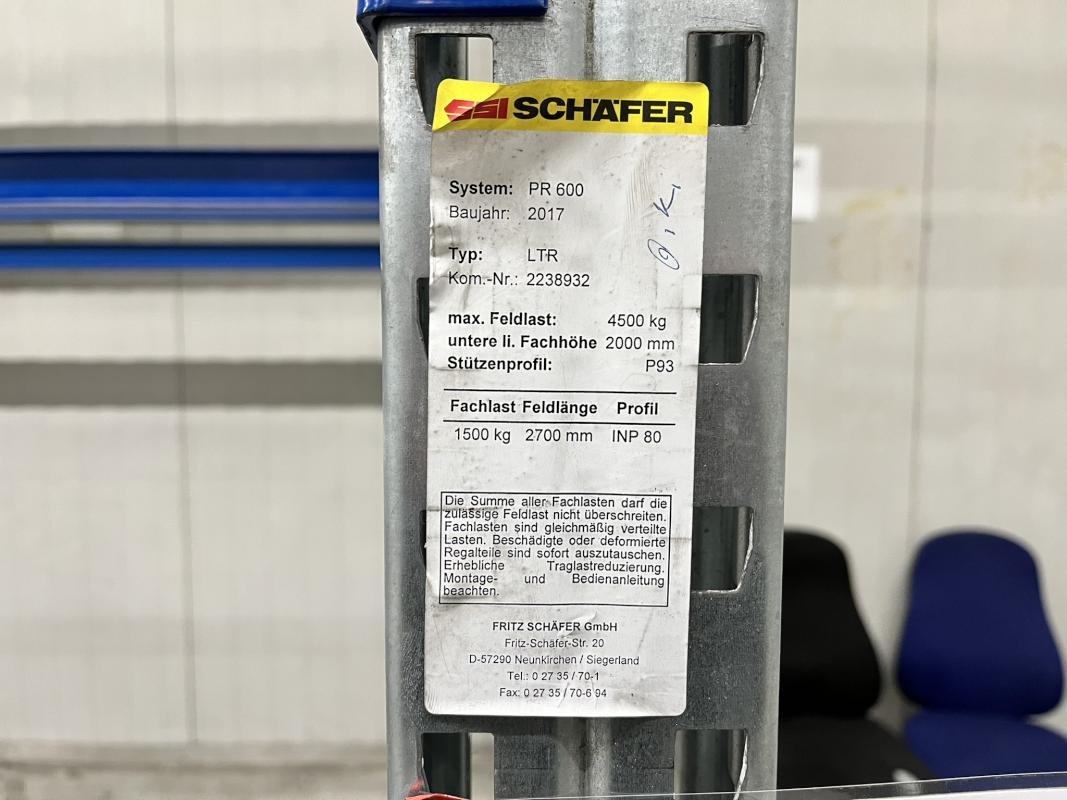 Fabrikat: SSI SCHÄFER, Typ: PR600, Baujahr: 2017, best. aus: 12 Elemente, B/T/H 2.700 x 1.050 x 7.000 mm, 3 Ebenen, Fachlast 1.500 kg, Feldlast 4.500 kg, silber/blau, ohne Inhalt