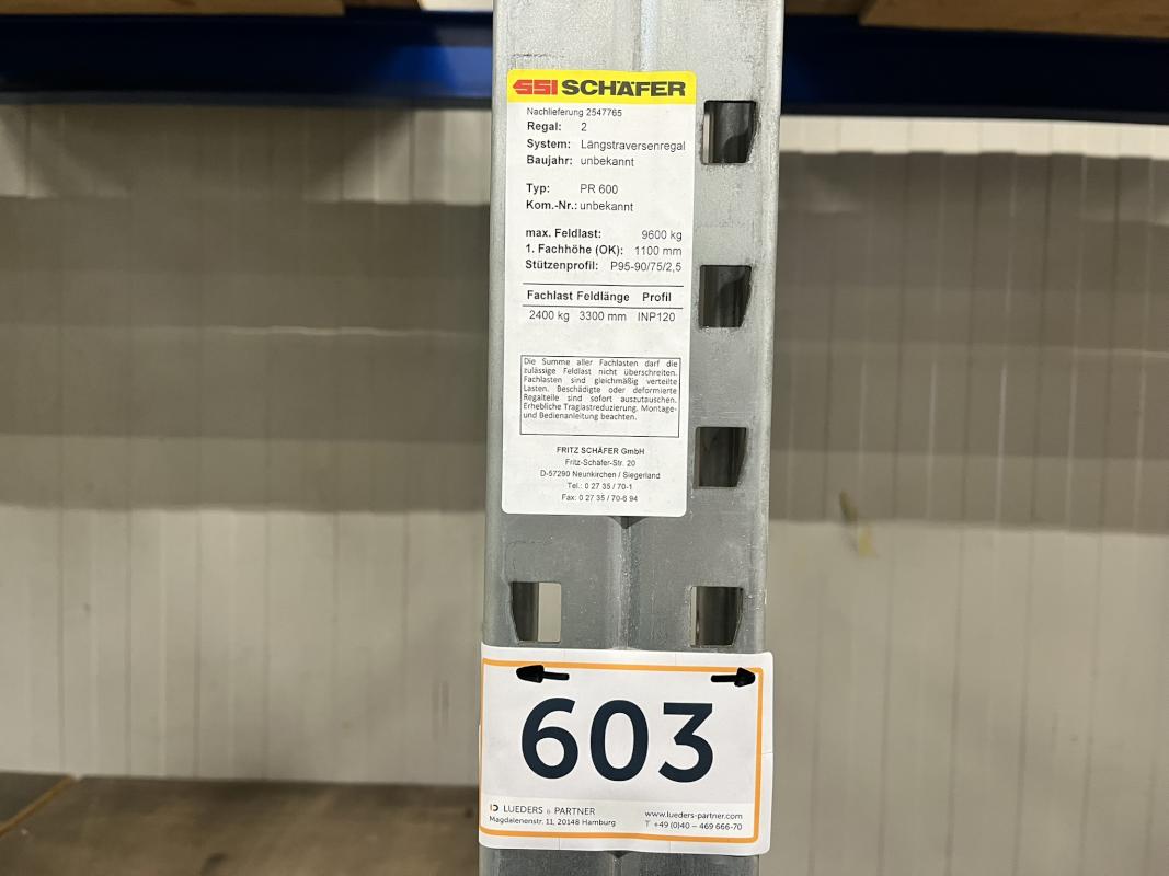 Fabrikat: SSI SCHÄFER, Typ: PR600, best. aus: 3 Elemente, B/T/H 3.300 x 1.000 x 6.000 mm, 3 - 4 Ebenen, Fachlast 2.400 kg, Feldlast max. 9.600 kg, silber/blau, ohne Inhalt