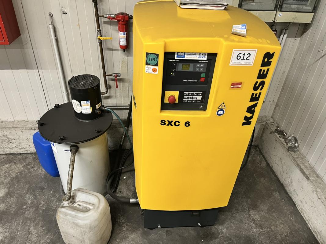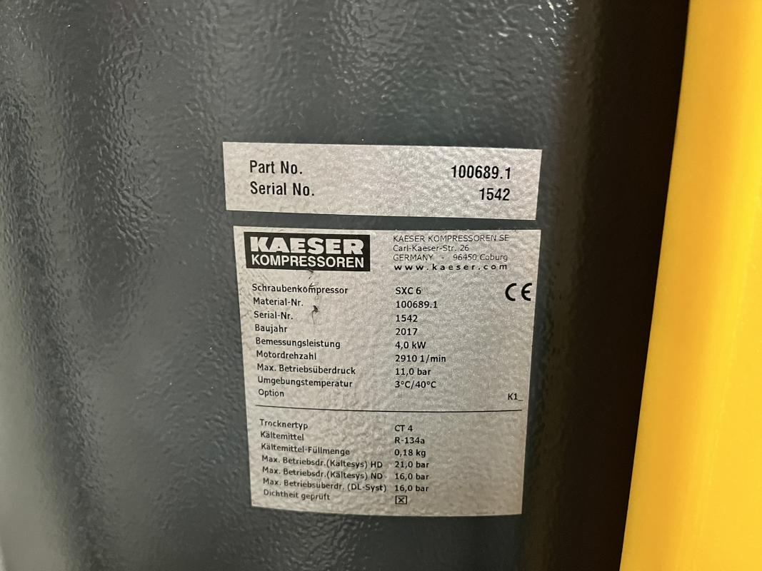 Fabrikat: KAESER, Typ: SXC6, Baujahr: 2017, Ser.-Nr. 1542, Kompressorsteuerung, Fabr. Kaeser, Typ Sigma Control Basic, elektr. Leistung 4 kW, Druck max. 11 bar, Betr.-Std. 8.119, integr. Trockner, Typ CT4, integr. Drucklufttank, Ölwasserabscheider