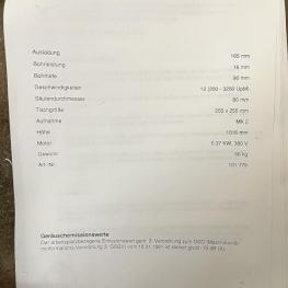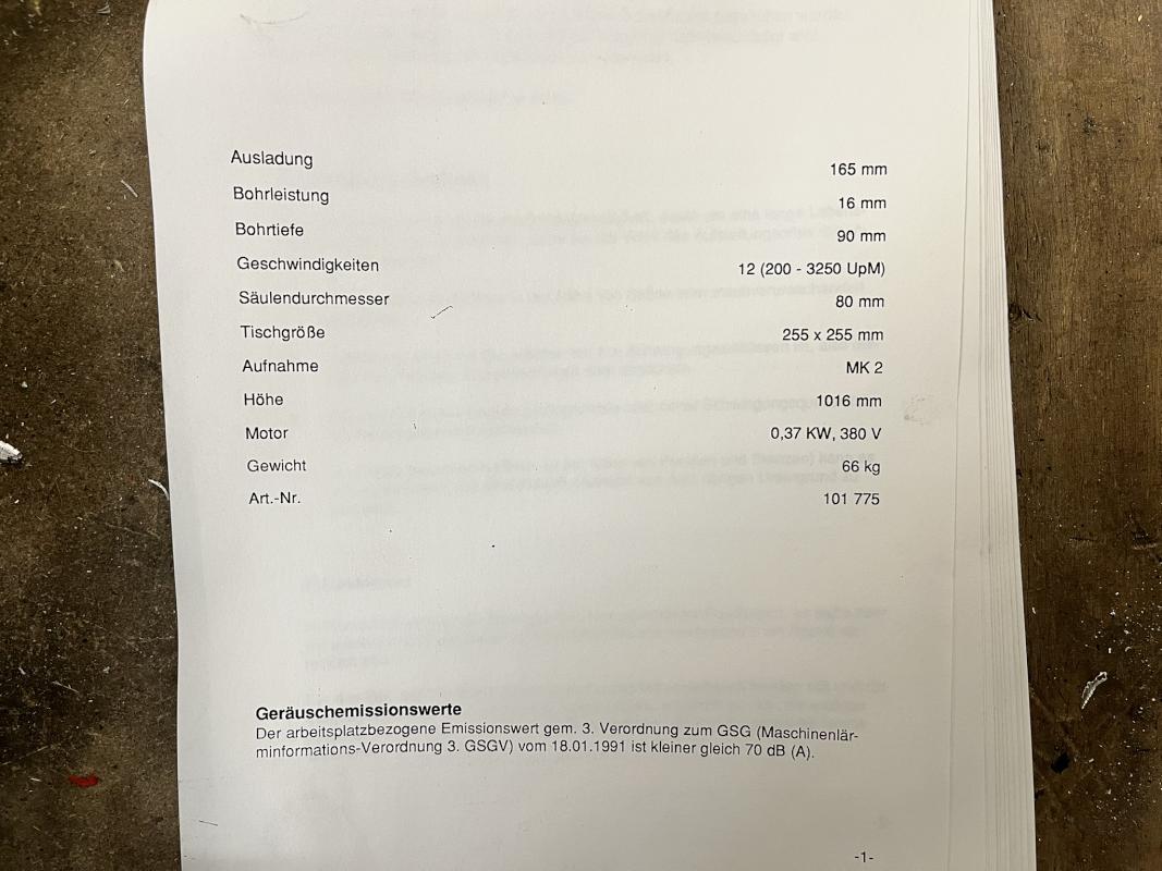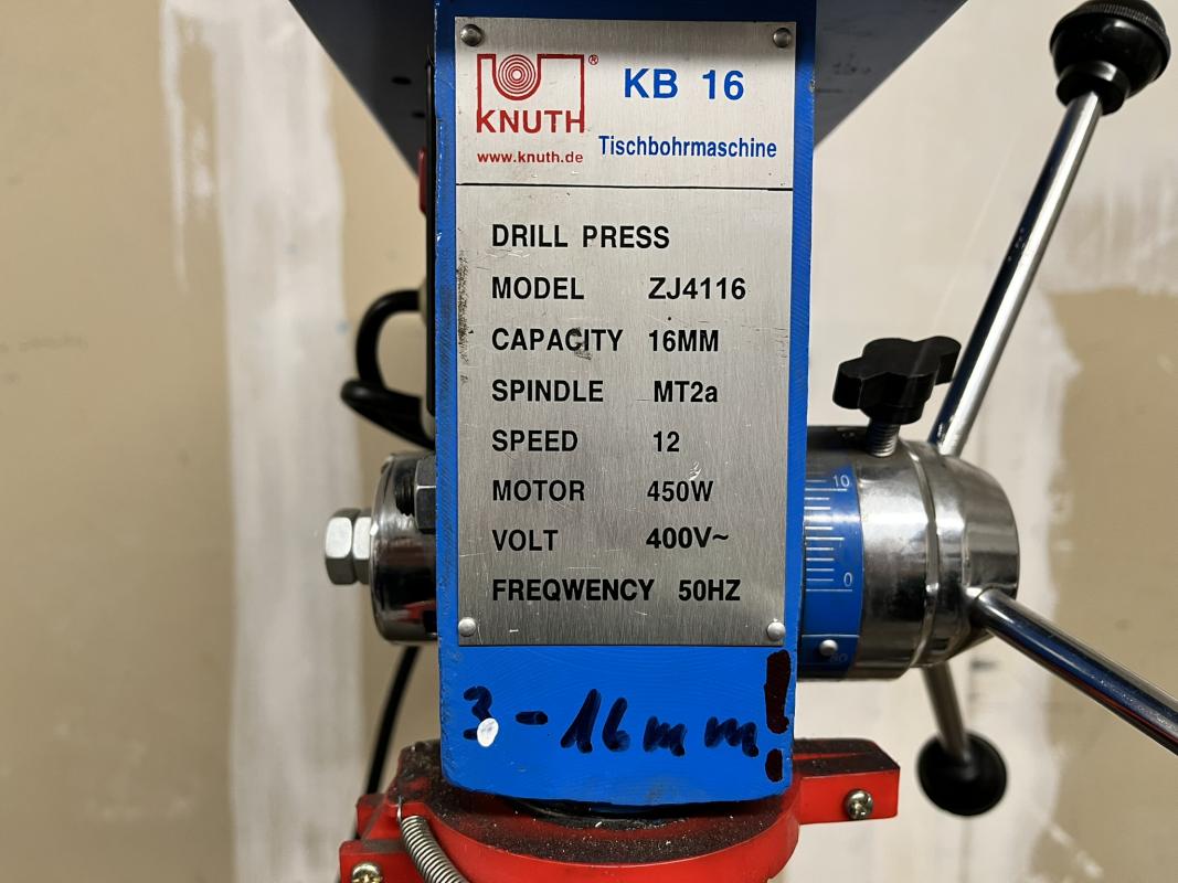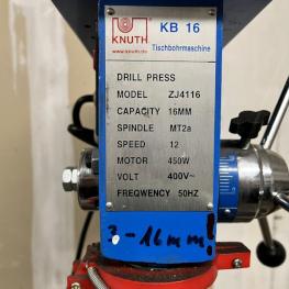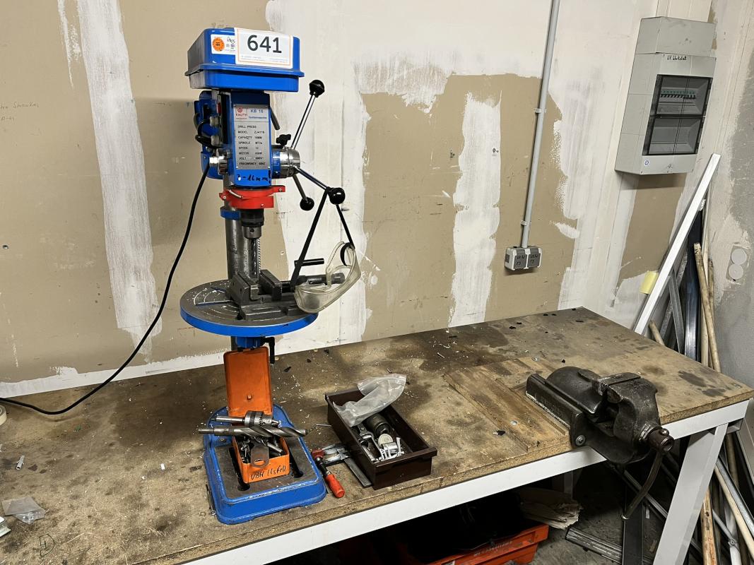 Fabrikat: KNUTH, Typ: ZJ4116, Drehzahl max. 3250 U/min, Ausladung 165 mm, Bohrleistung 16 mm, Schnellspannfutter, Tischgröße 255 x 255 mm, Bohrtiefe 90 mm, Schraubstock, 1 Werkbank ca. 2.600 x 800 mm, Schraubstock, Fabr. EMF 125, Backenbreite 125 mm