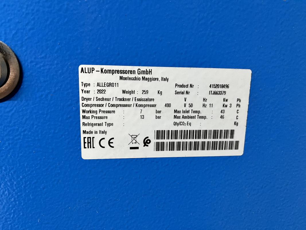 Fabrikat: ALUP, Typ: Allegro11, Baujahr: 2022, Ser.-Nr. ITJ663379, Betriebsdruck 7 bar, Bh 3.097, Kältetrockner, Fabr. Alup, Typ ADQ, ohne Verrohrung