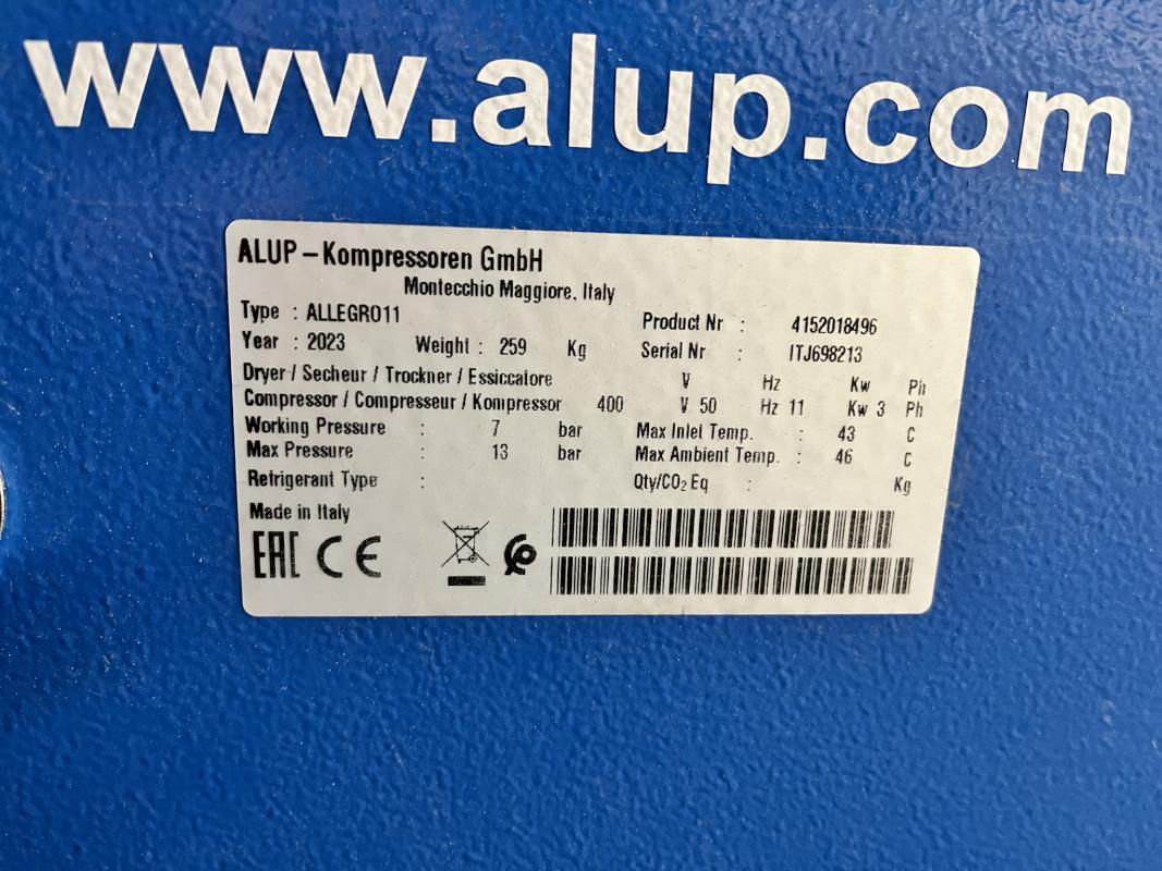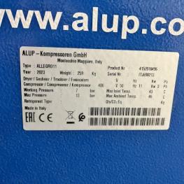 Fabrikat: ALUP, Typ: Allegro11, Baujahr: 2023, Ser.-Nr. ITJ698213, Betriebsdruck 7 bar, Bh 8.407, Kältetrockner, Fabr. Alup, Typ ADQ, ohne Verrohrung