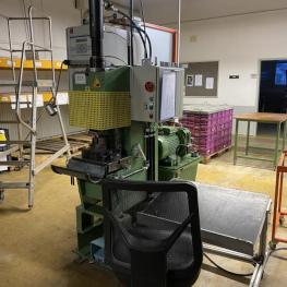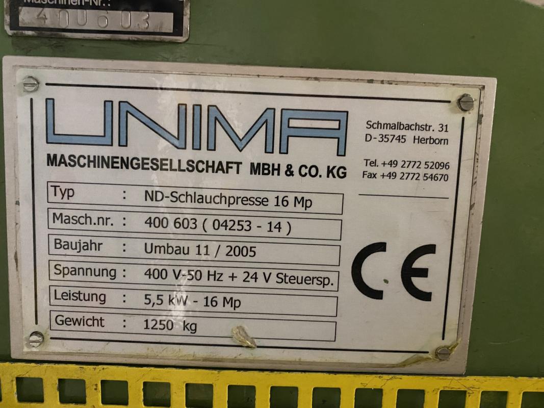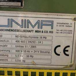 Fabrikat: UNIMA, Baujahr: 2005, Ser.-Nr. 400603, C-Ständer, Druck max. 160 kN, Hydraulikaggregat, Schalt-/Steuerschrank, Operator Panel, Fabr. Magelis, Maschinenbeleuchtung, Industriedrehstuhl, Bereitstellungsregale für Kisten
