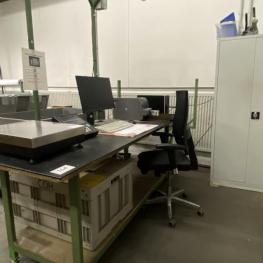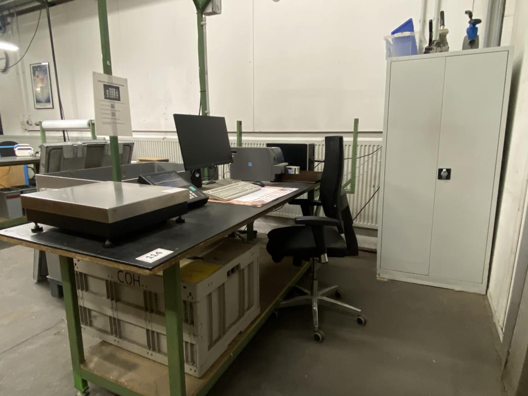 Fabrikat: METTLER-TOLEDO, Wägebereich max. 60 kg, Plattform 400 x 500 mm, Packtisch 2.000 x 750 mm, Etikettendrucker, Fabr. CAB, Typ A6+, 24" TFT-Monitor, Fabr. BenQ, Tastatur, Maus, Drehstuhl, schwarz, Oberlicht, Stahlschrank, 2-türig, lichtgrau
