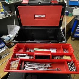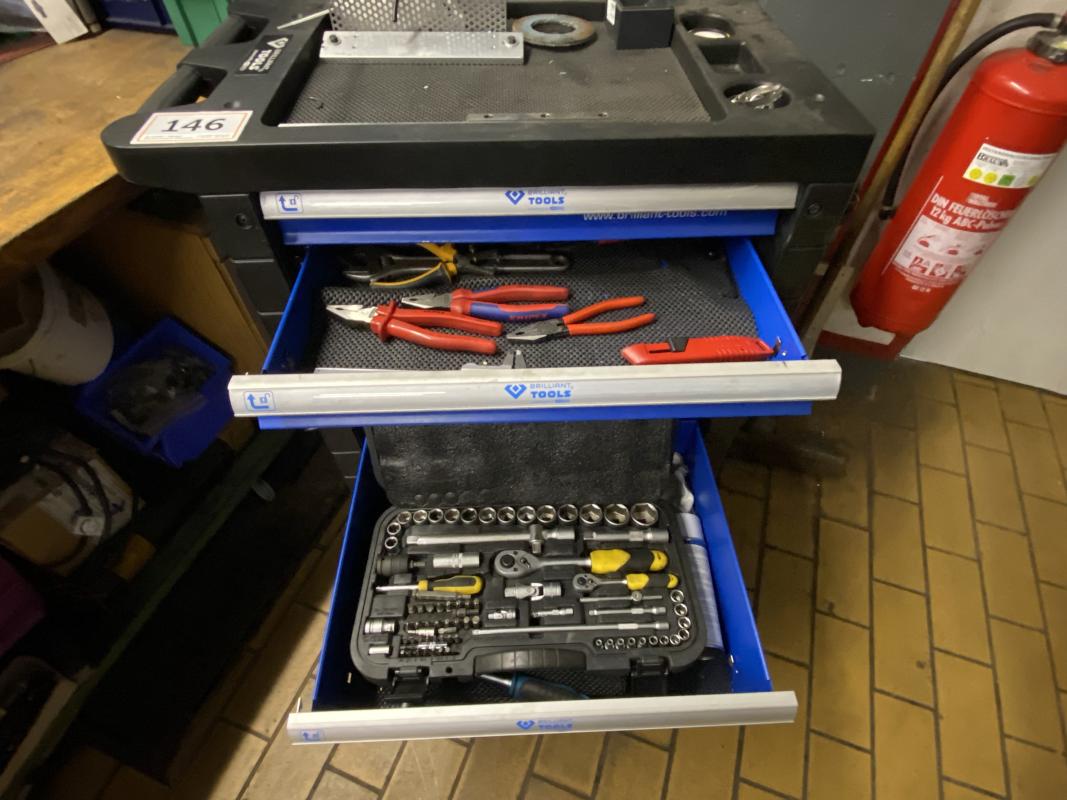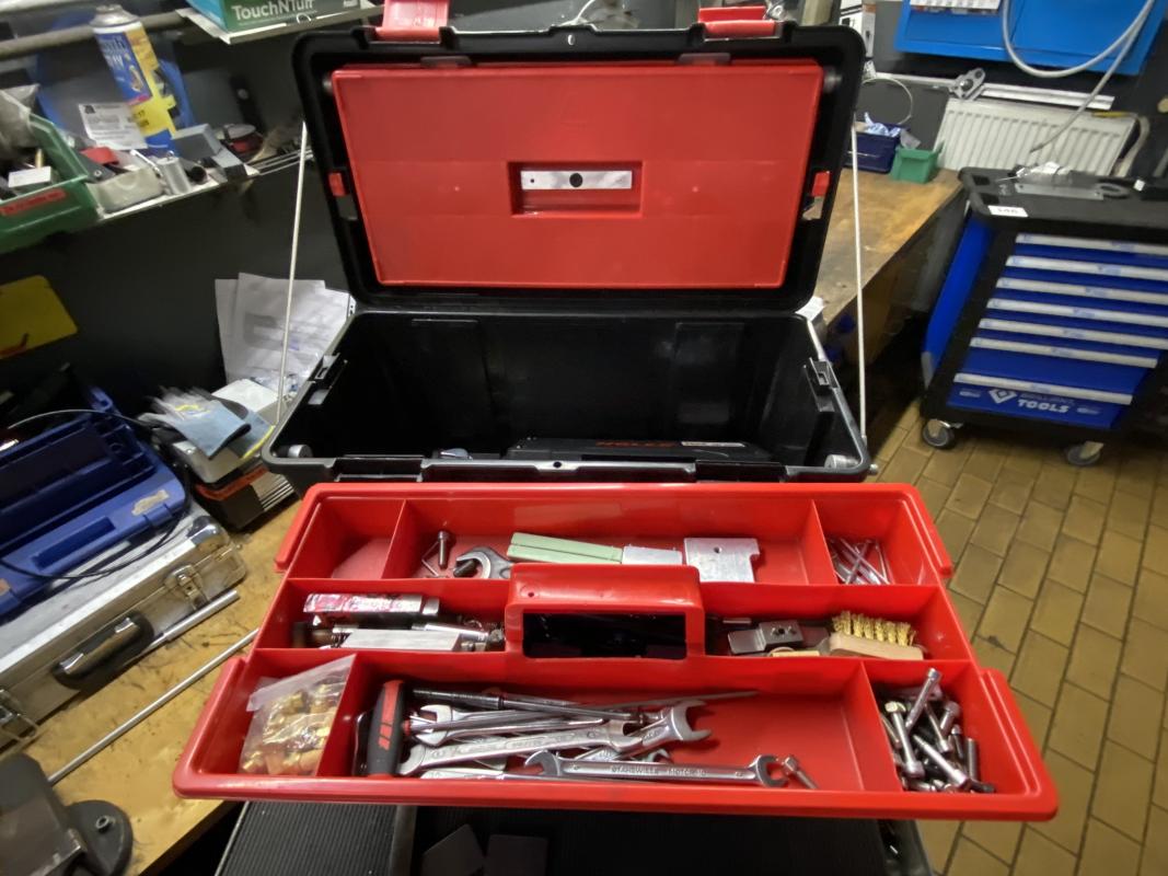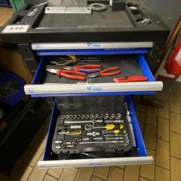 ca. 4 lfm, 3 Schraubstöcke, Backenbreite 125mm, 1 Werkzeugwagen Fabr. KS Tools, 7 Auszüge, 1 Posten Handarbeitszeuge