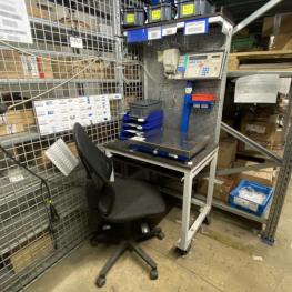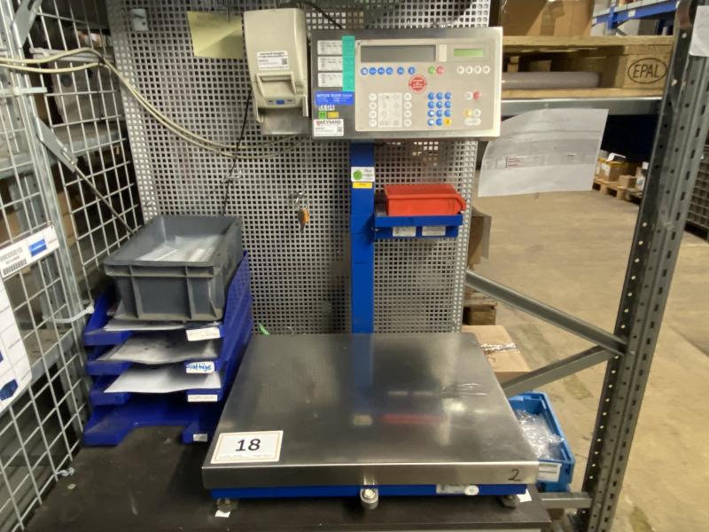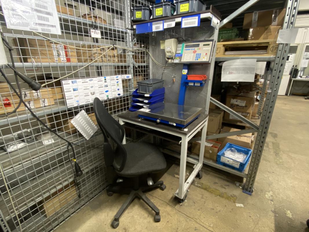 Fabrikat: METTLER-TOLEDO, Wägebereich 200 g - 30 kg, Plattformgröße 500 x 400mm, Anzeigeterminal digital, Bondrucker, Arbeitstisch, Lichblechrückwand, Bürodrehstuhl schwarz
