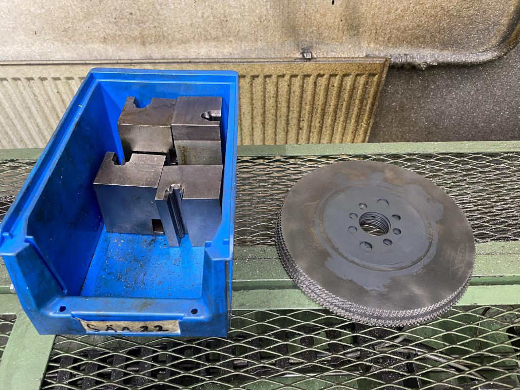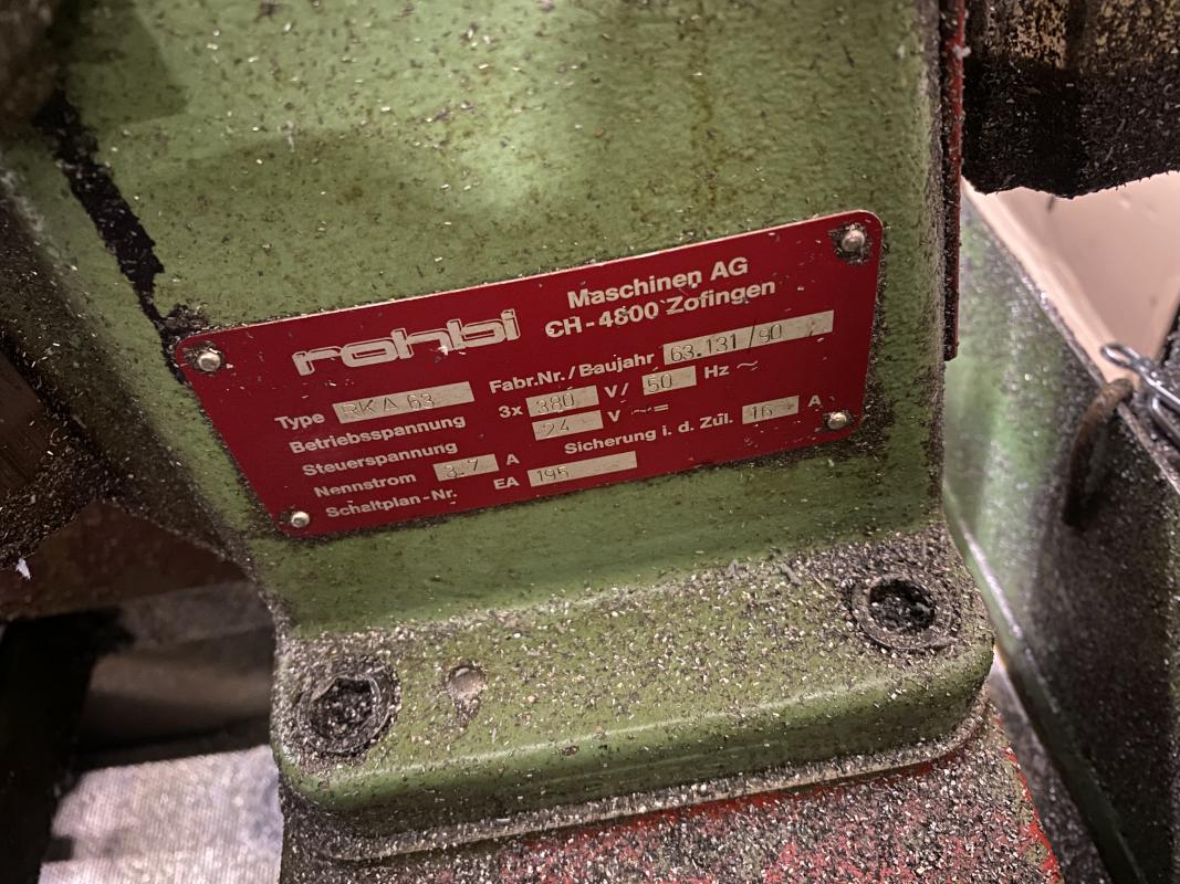 Fabrikat: ROHBI, Typ: RKA 63-1250-54/108, Baujahr: 1990, Ser.-Nr. 63.131, best. aus: Zuführung, Vorschub, Sägeeinheit, Schraubstock, Kühlmitteleinrichtung, Steuerpult, Hydraulikaggregat, Spänecontainer, rollbar, 1 Posten Sägeblätter, Spannbacken