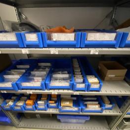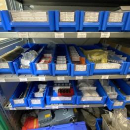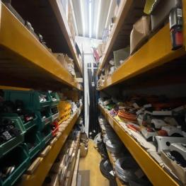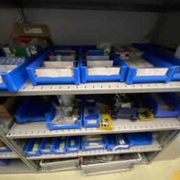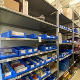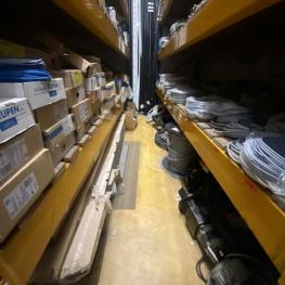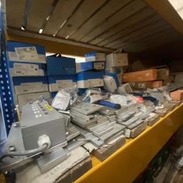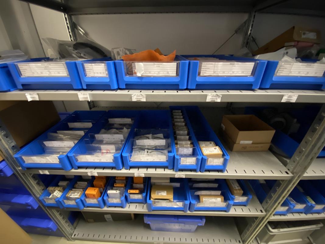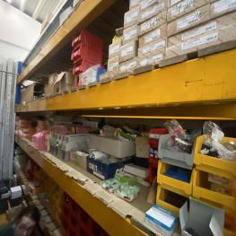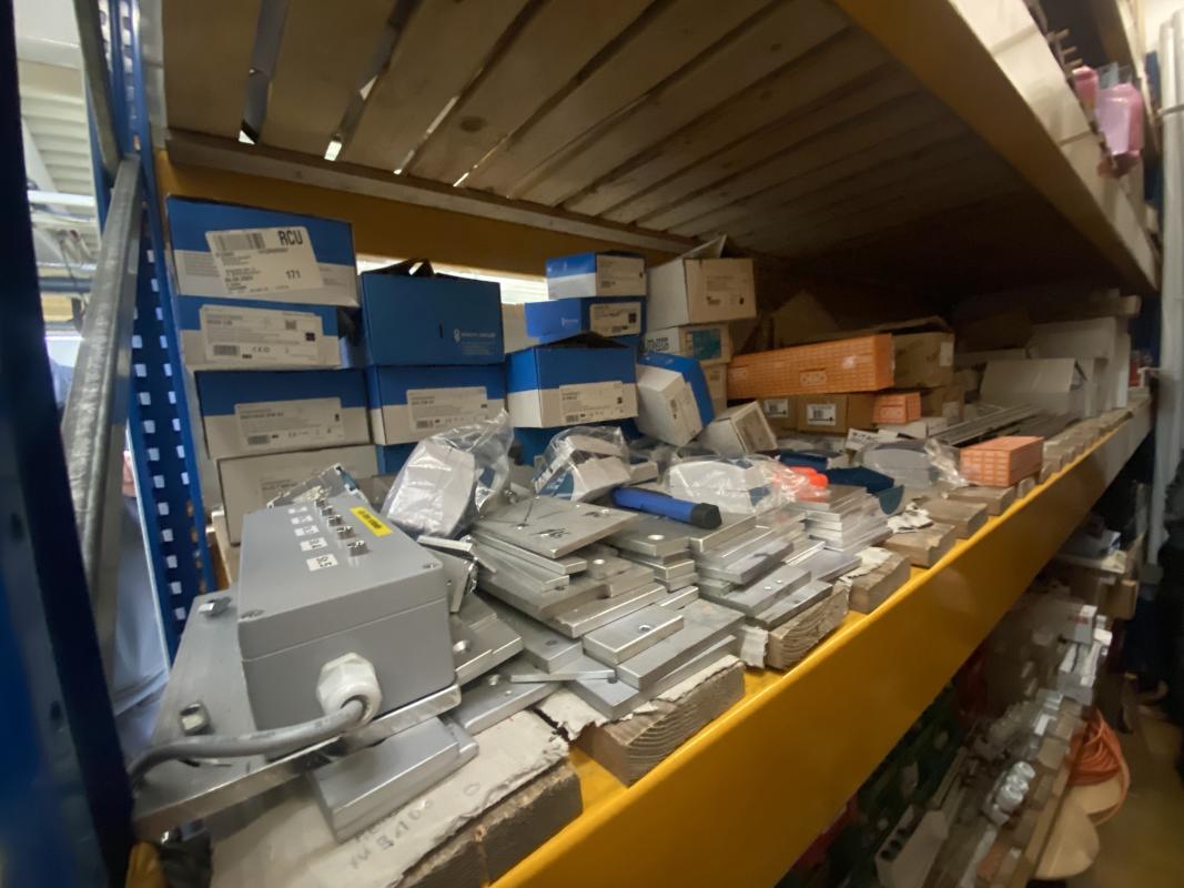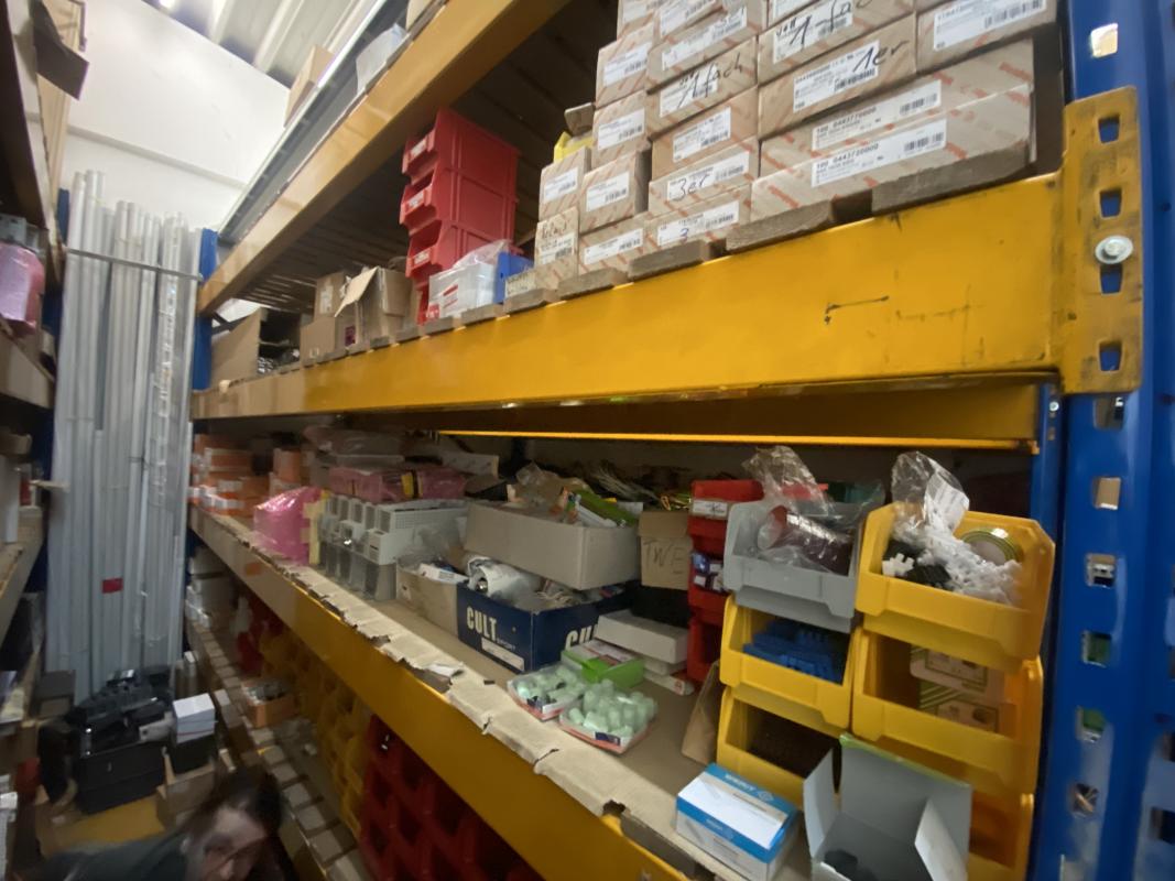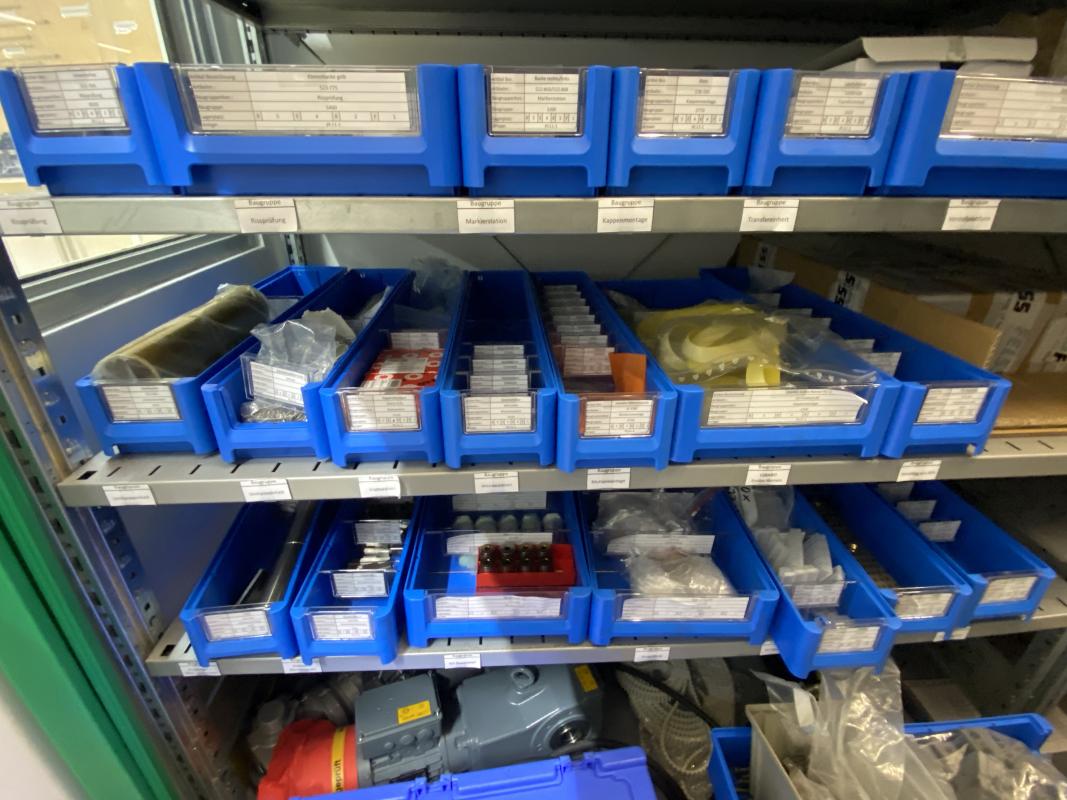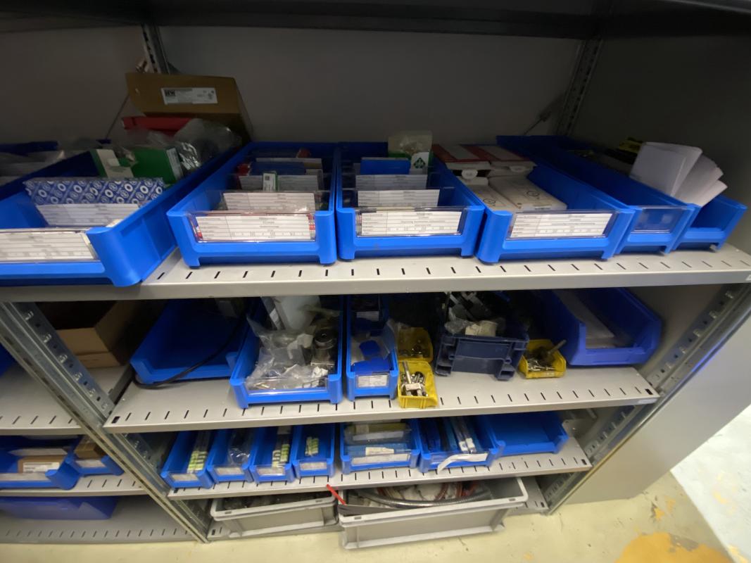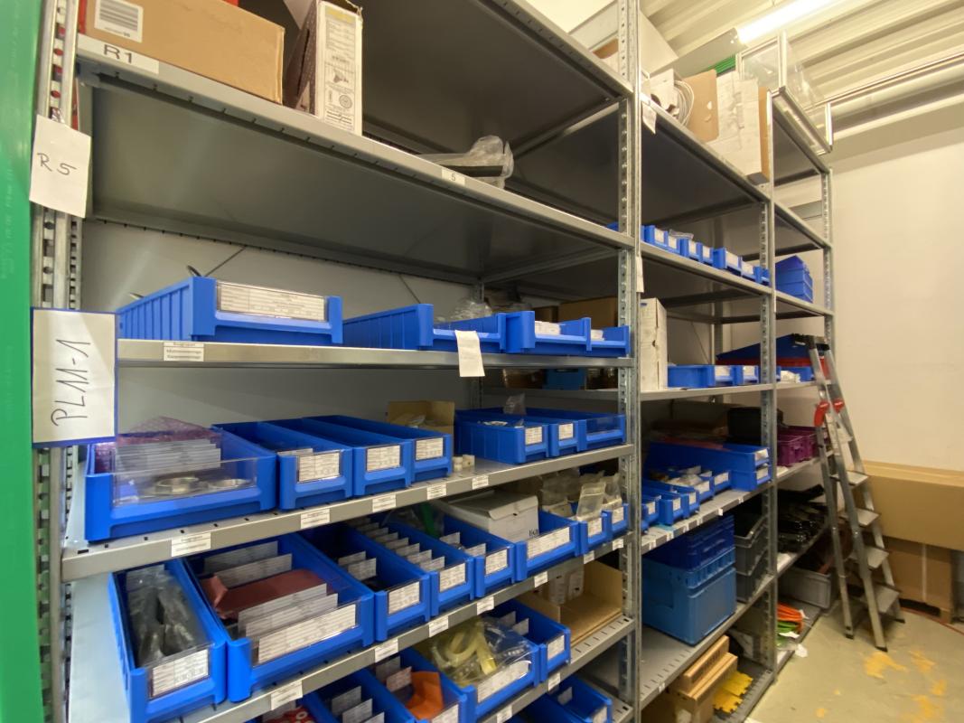 2 Rauminhalte "Lager 2/ Lager 3": Regale 5 - 7 Ebenen, 2 Klappleitern, Stahlschrank, 2-türig, Lagersichtkästchen, Inhalt: Elektrische, Mechanische, Pneumatische Komponenten (teilw. Originalverpackt)