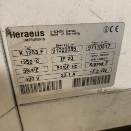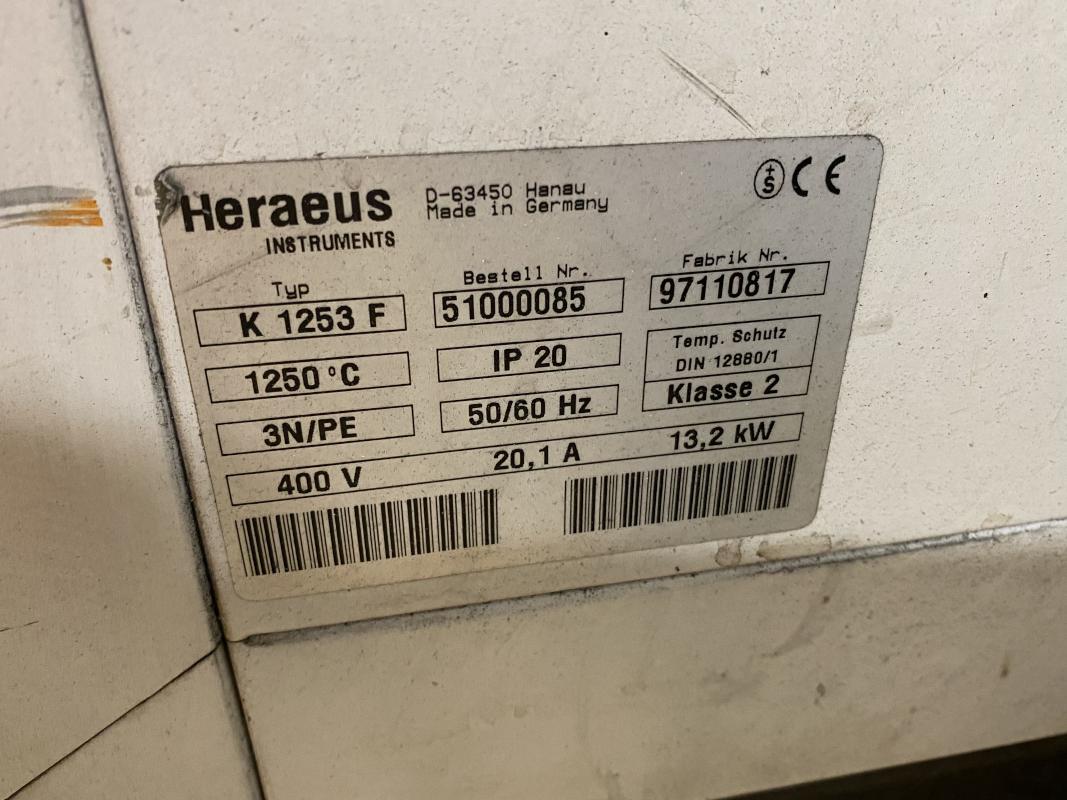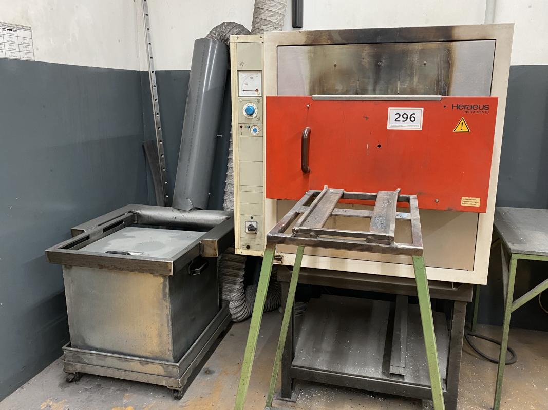 Fabrikat: HERAEUS, Typ: K1253F, Ser.-Nr. 97110817, Temperatur max. 1.200° C, Innenabmessungen B/T/H 400 x 200 x 180 mm, analoge Temperaturanzeige, Einschubgestell Metall, Abkühl / Abschreckbecken, inkl Abzugsnetilator, 1 Posten Verrohrung