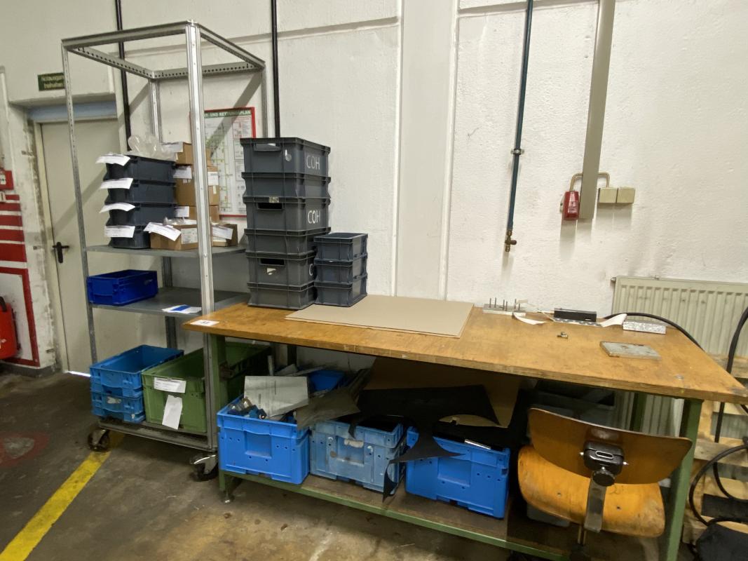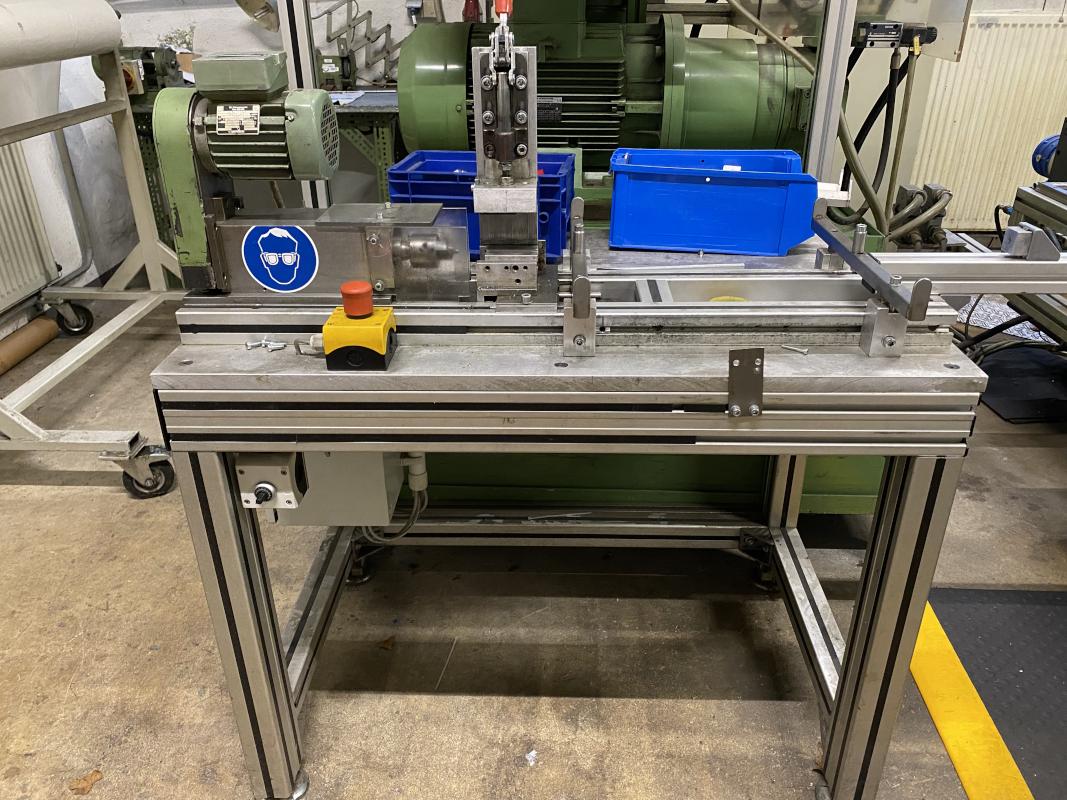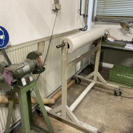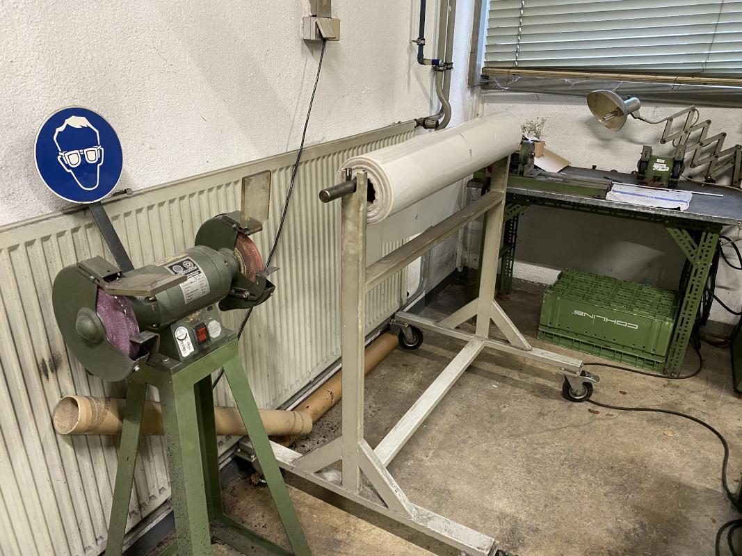 2.000 x 750 mm, Doppelschleifbock inkl. Standkonsole, Rollregal, 2 Ebenen, Folienabroller, Arbeitsbreite 1.000 mm, Spindelbock, Doppelschleifbock (Tischmodell), Zentrierstation mit Gerätetisch aus Alu-Systemprofilen, ohne Inhalt