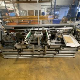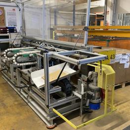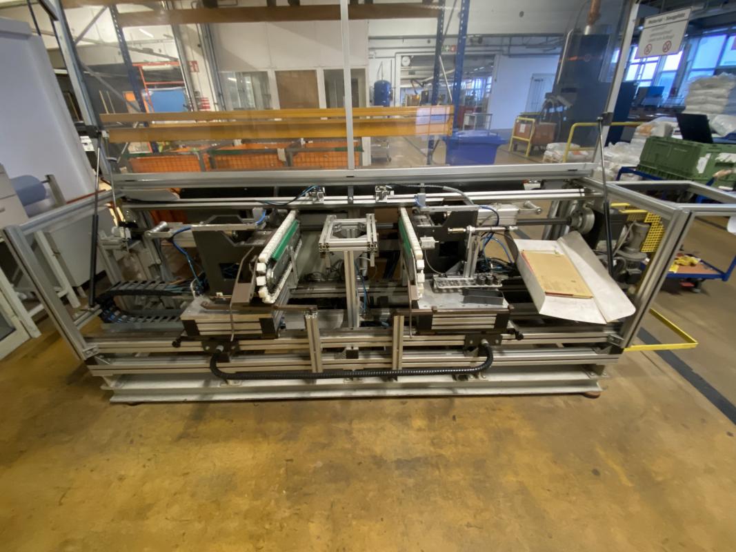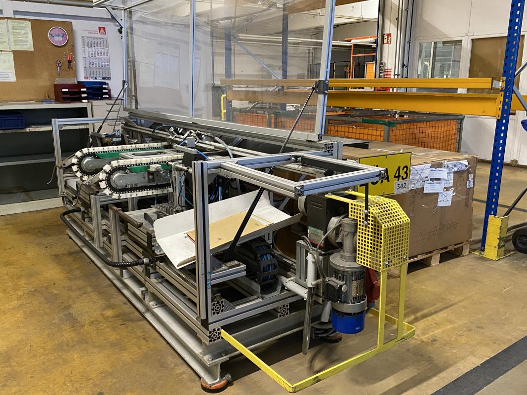 2 Bördelstationen, Transport über Kette, Anschlag, Greifer, Schalt- und Steuerschrank, Gestell aus Alu-Systemprofilen, Schutzhaube