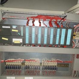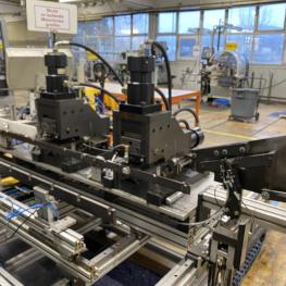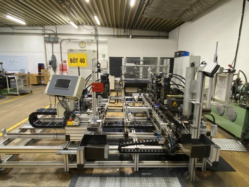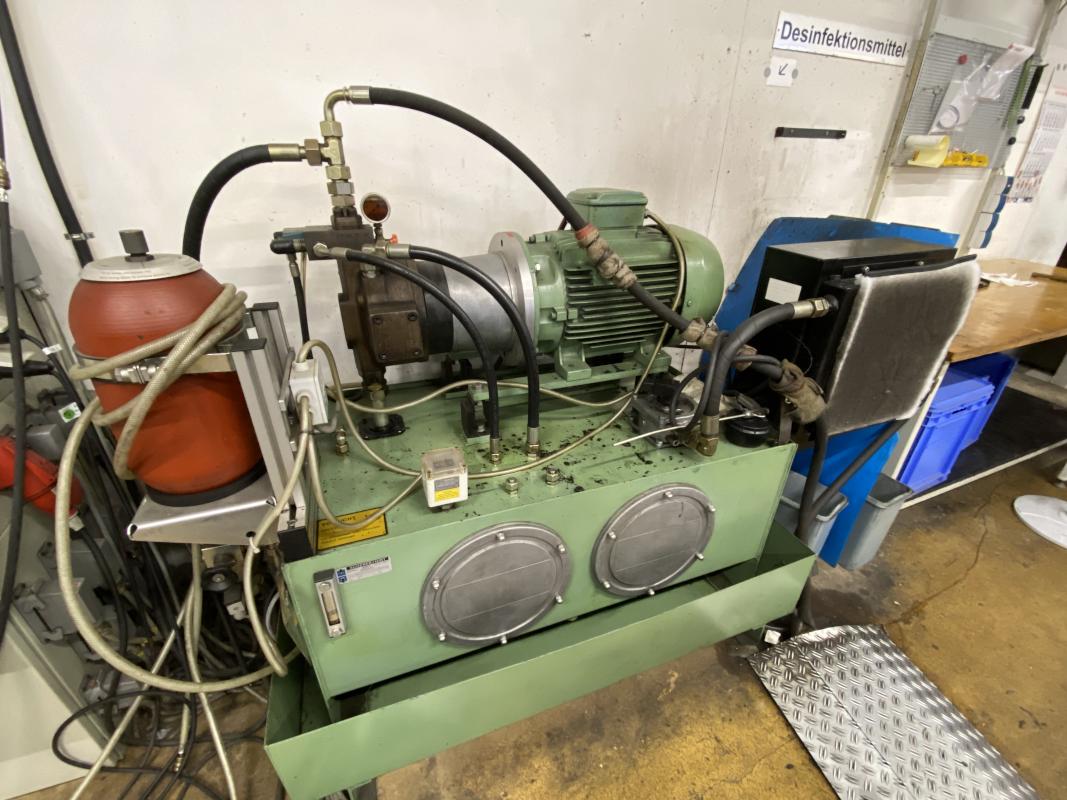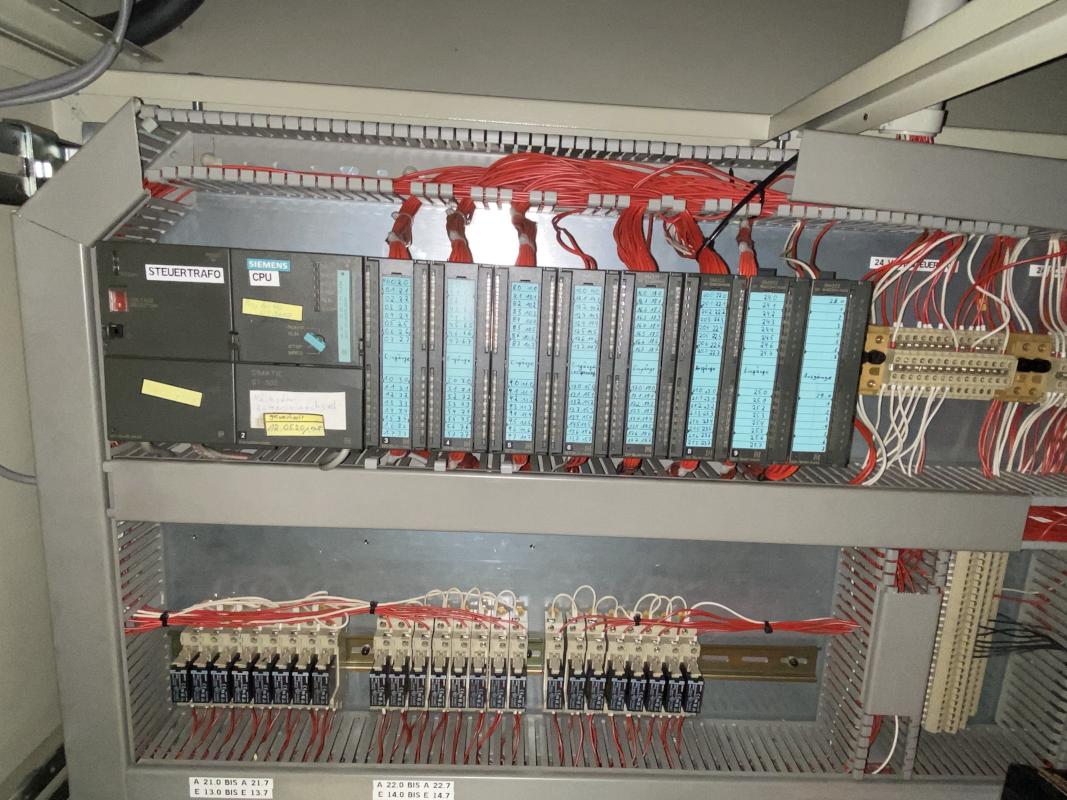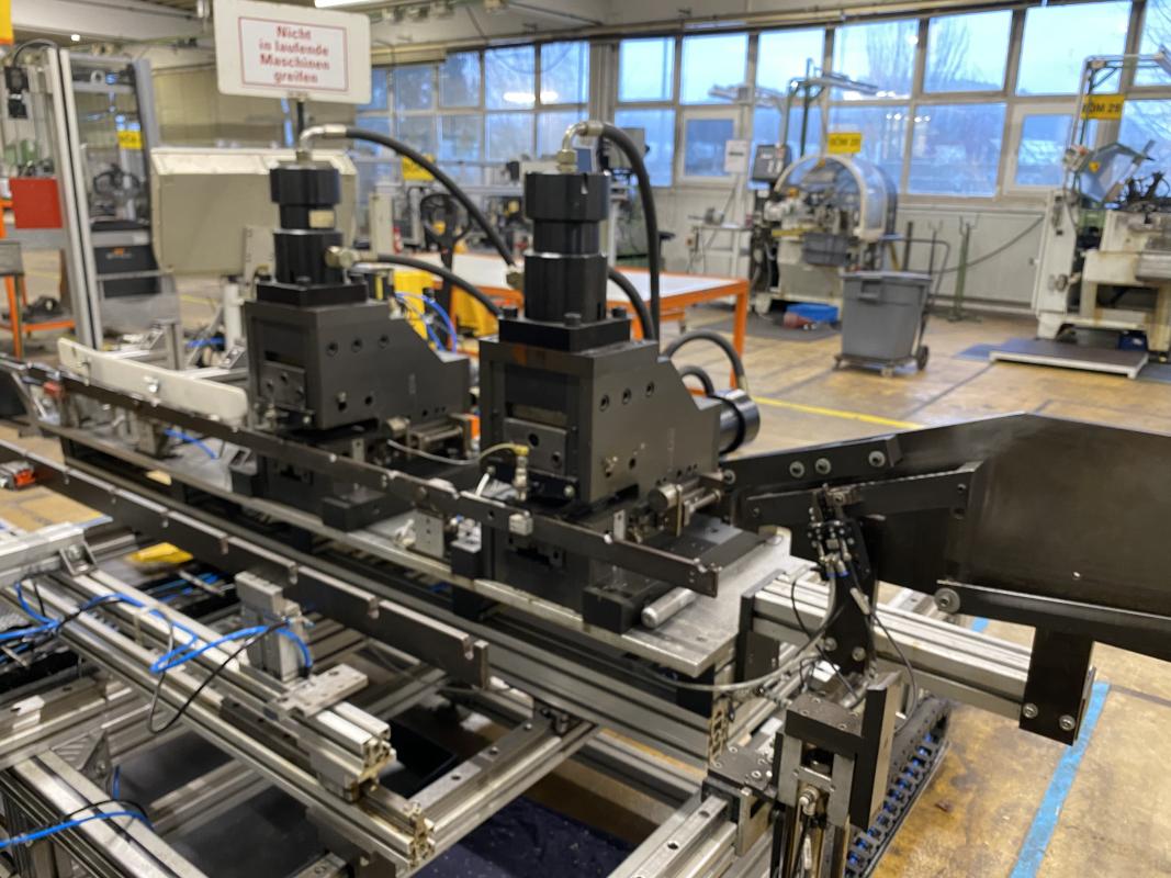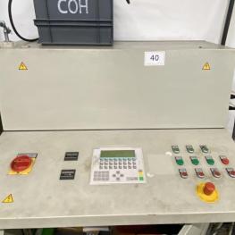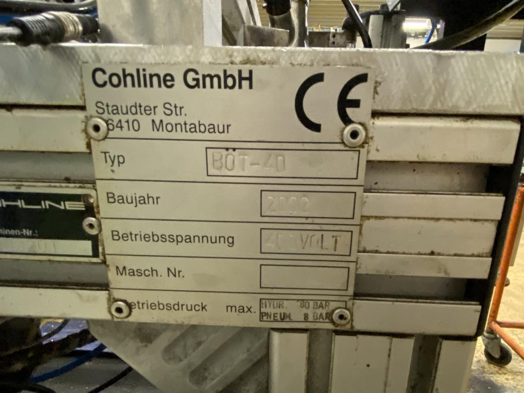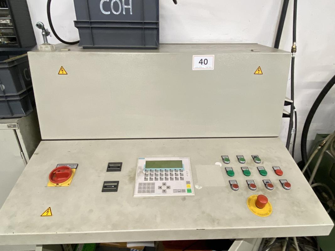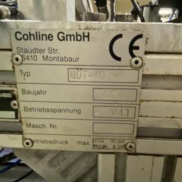 Fabrikat: COHLINE (EIGENBAU), Baujahr: 2002, Steuerung: Fabr. Siemens, Typ S7-300, Durchlauftaktförderband, 5 Bearbeitungseinheiten, Schalt-/Steuerschränke, Operator Panel Fabr. Siemens, Typ Simatic OP 17, 2x Kamera, Auswerteinheit Fabr. Panasonic, Typ PV300, Hydrauliaggregat Scherer+Hirth,Werkbank mit Schraubstock