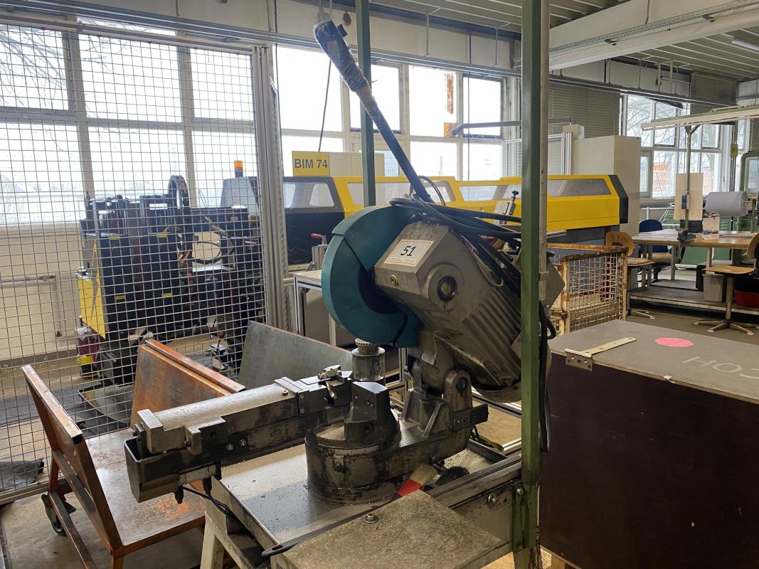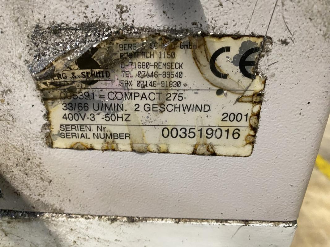 Fabrikat: BERG & SCHMID, Typ: Compact 275, Baujahr: 2001, Ser.-Nr. 9016, Gerätetisch, Gehrung + 45°, Mikrosprüheinrichtung