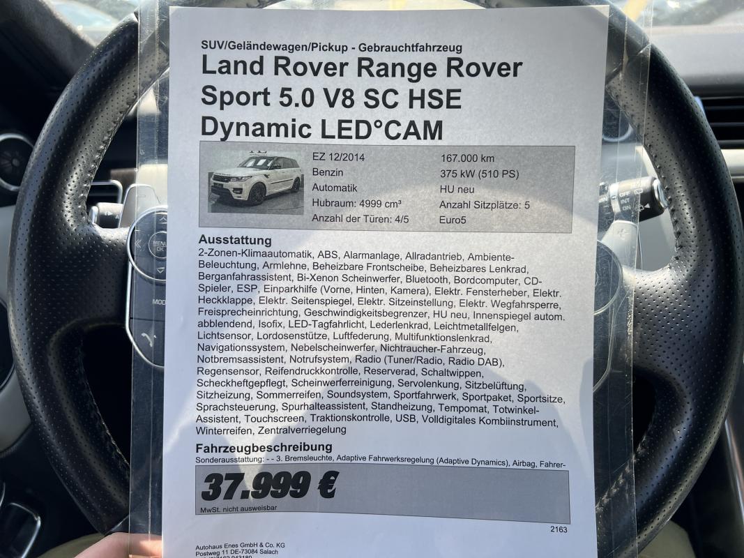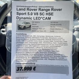 Make: JAGUAR LAND ROVER, Model: Range Rover Sport, Gasoline, EURO 5, 375 kW, displacement 4,999 cm³, Ident-No. SALWA2EF7FA602163, EZ 12/14, approx. 87,520 km (read off)