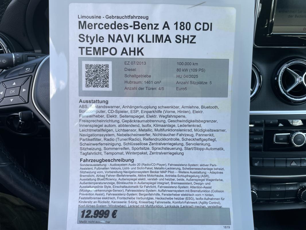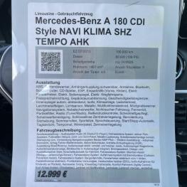 Make: MERCEDES BENZ, Model: A 180 CDI, Diesel, EURO 5, 80 kW, displacement 1,461 cm³, Ident-No. WDD1760121J151819, EZ 07/13, approx. 102,715 km (read off)