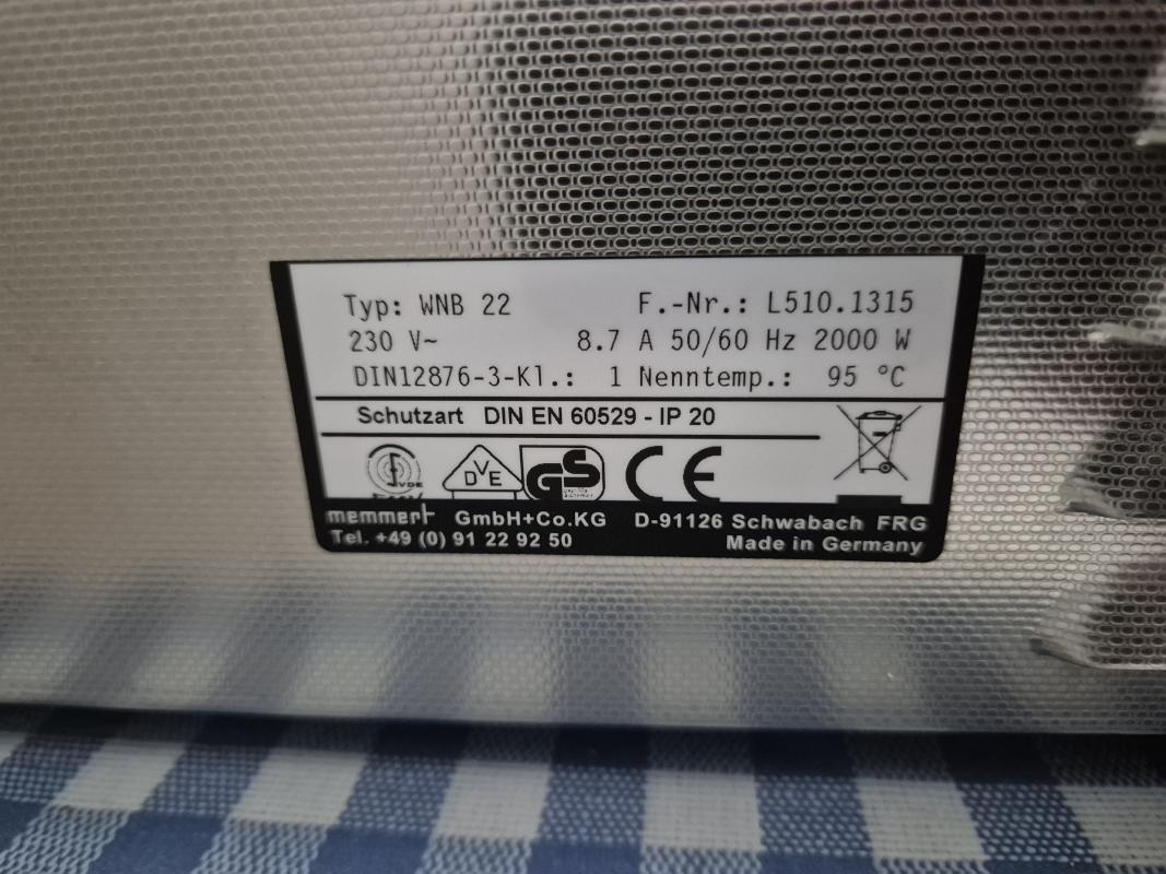 Make: MEMMERT, Model: WNB 22, Ser. no. L510.1315, table-top appliance, volume 22 litres, power 2,000 W, nominal temp. 95°C