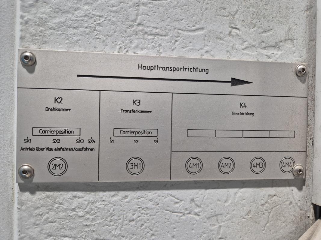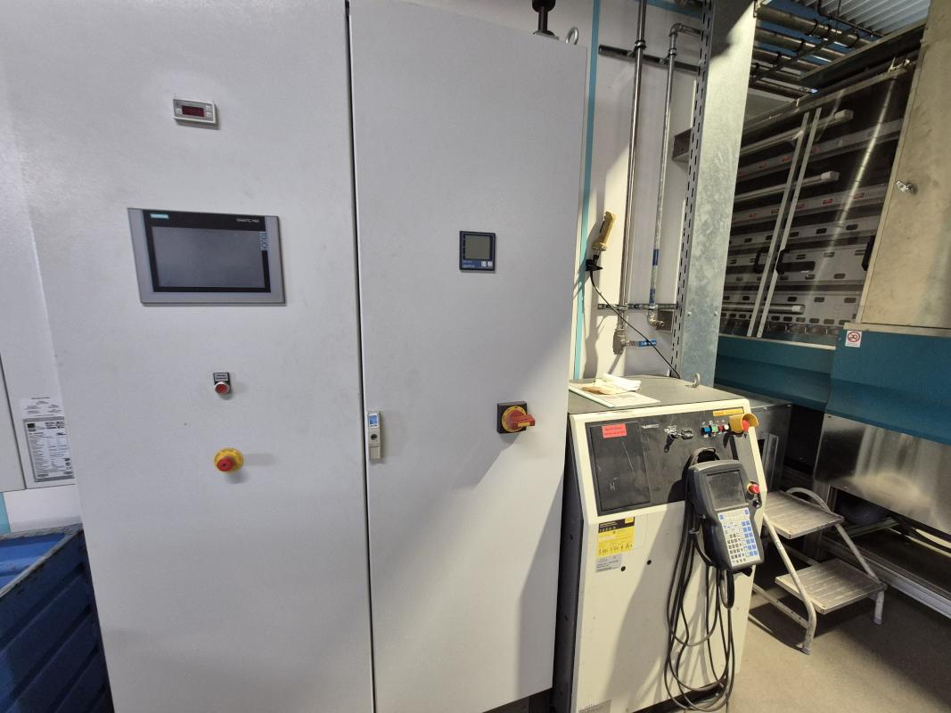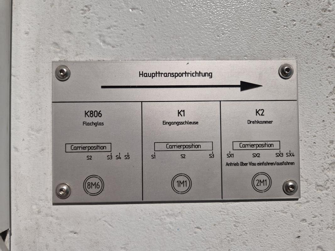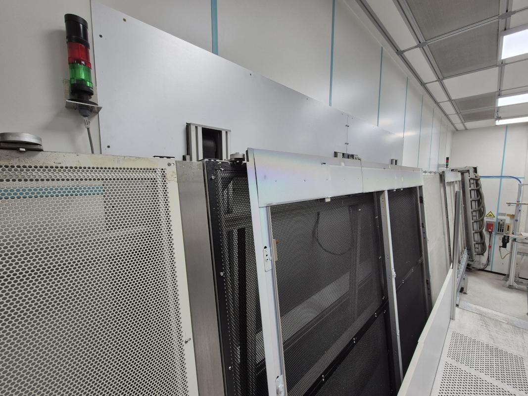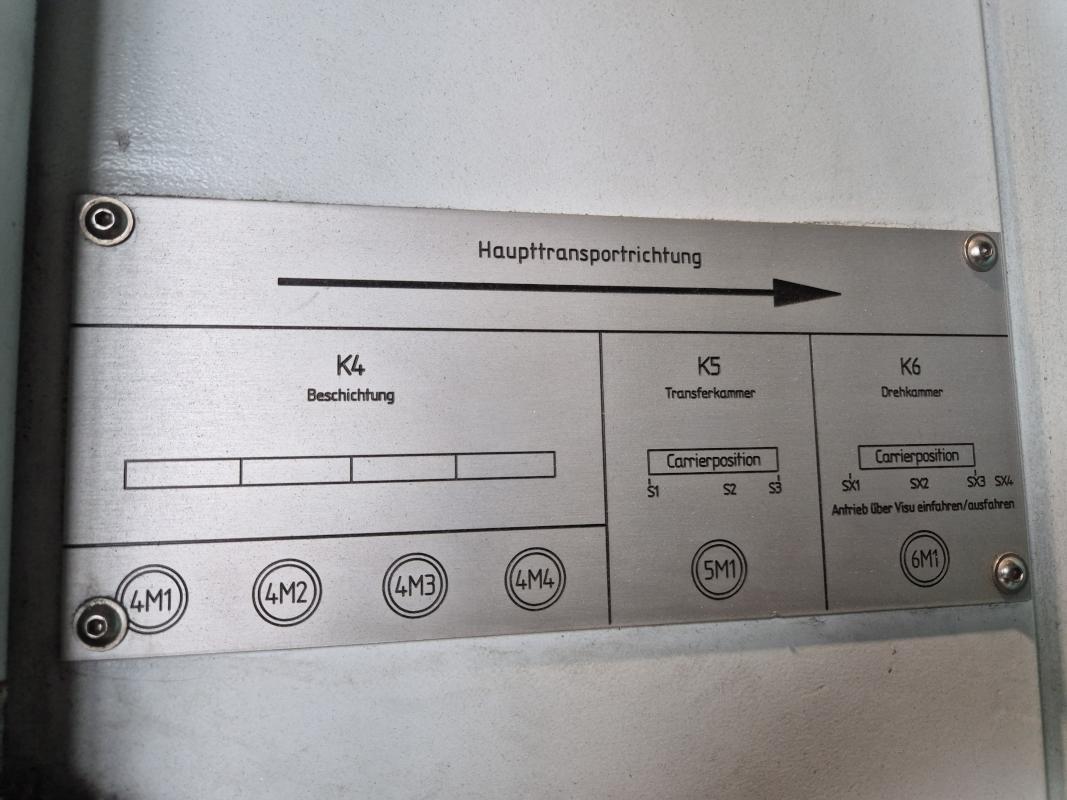 Make: ARDENNE DRESDEN, Model: GC 180 V/CR, Year of construction: 2003, Ser. no. 1-0846A, int. No. 6670, system no. 266.700 / 266.701 / 266.771 / 266.773 / 266.779 / 266.793 / 266.809 / 280.494, L/W approx. 41 x 6 m, H with platforms approx. 6,200 mm, cooling capacity approx. 950 kW, cooling water consumption approx. 120 m³/h, transmission reflection measuring system, ionisation system, twin cathode (performance enhancement), vacuum chamber K1 to K7, carrier transport system with return system K8, entrance airlock, intermediate chamber, rotary chamber, transfer chamber, process chamber, transfer chamber, rotary chamber, sputter section, pump section, heater horizontal / vertical, with gondola and carousel, 2 loading stations, cooling water circuit, process gas, pump sections, clean room with personnel and material airlock, approx. 30 control cabinets (upper level), control station, with computers, monitors, software with licences, transmission measuring device, optimisation in 2017, control station, office furniture equipment, server cabinet, int. no. WDEFIW913, workstation, manufactured by HP, Intel Core i2 processor, keyboard, mouse, 22" TFT monitor, manufactured by Samsung, type SyncMaster 22. Samsung, type SyncMaster 2243, handling robot, Fanuc, type M-710I, year 2019, system no. 236.529.000, with gripper arm, protective plexiglass housing, power source, manual control, flat glass washing and drying machine, vertical, Schraml, type Topclear Spezial / Super 13-26, year 2017, consisting of: Ser. no. 2106/17, system no. 266.776.000, washing and drying exclusively for flat glass panes, maximum height 1,600 mm in one pass, glass thicknesses from 3 - 12 mm, operating speed from 1 - 5 m/min, consisting of: Infeed module, washing machine, washing machine body with brushes, outfeed module, washing machine, fan housing with air filter, water basin with pumps, control panel, electrical cabinet, approx. 16 different steel cabinets on platform, accessories, spare parts