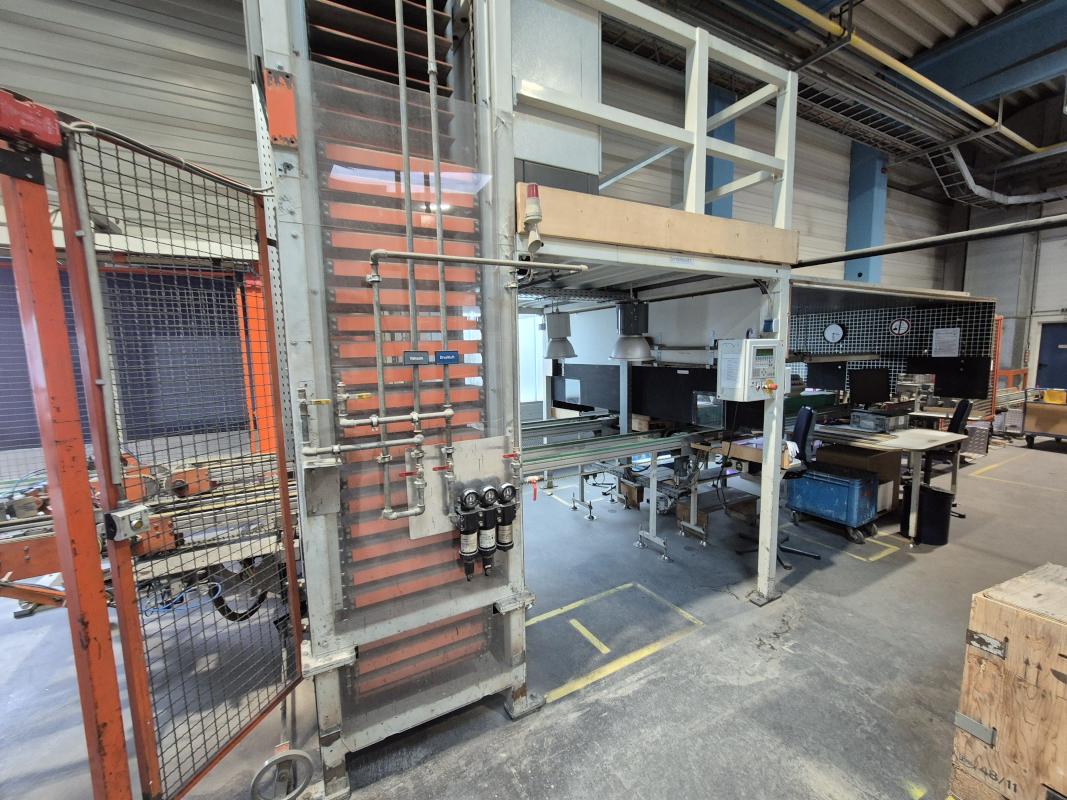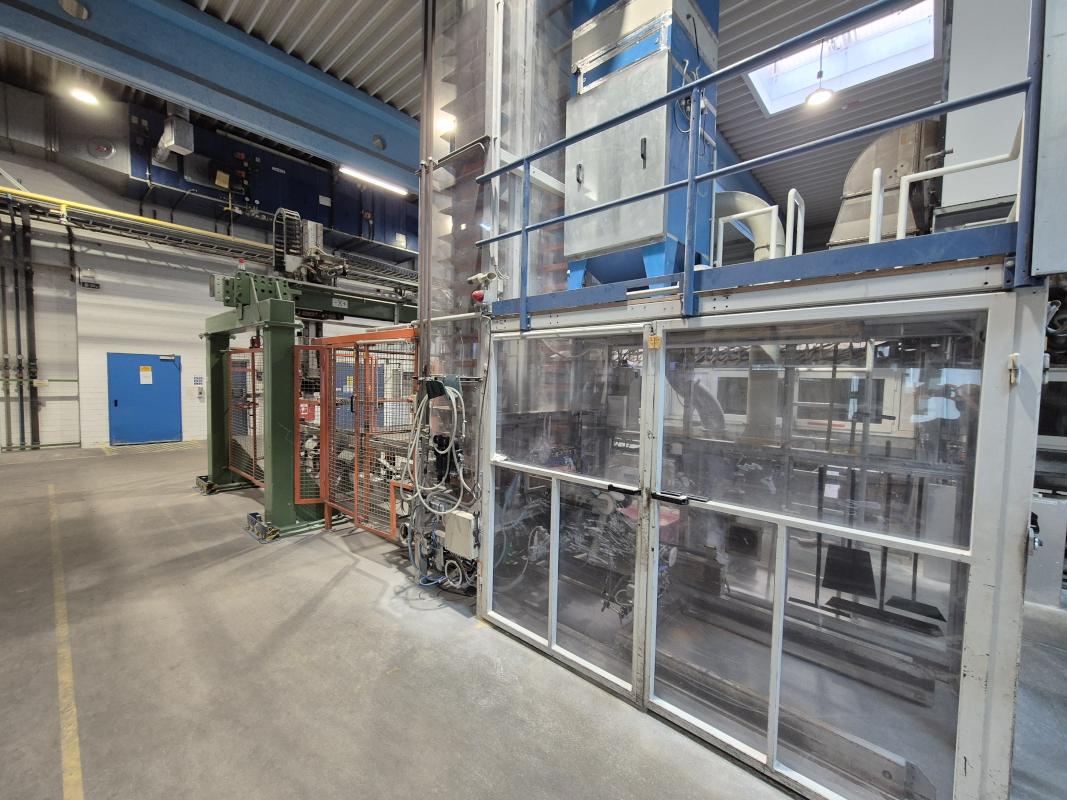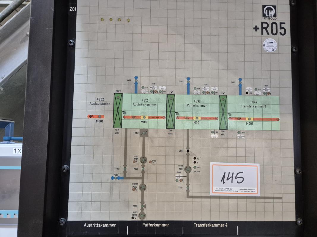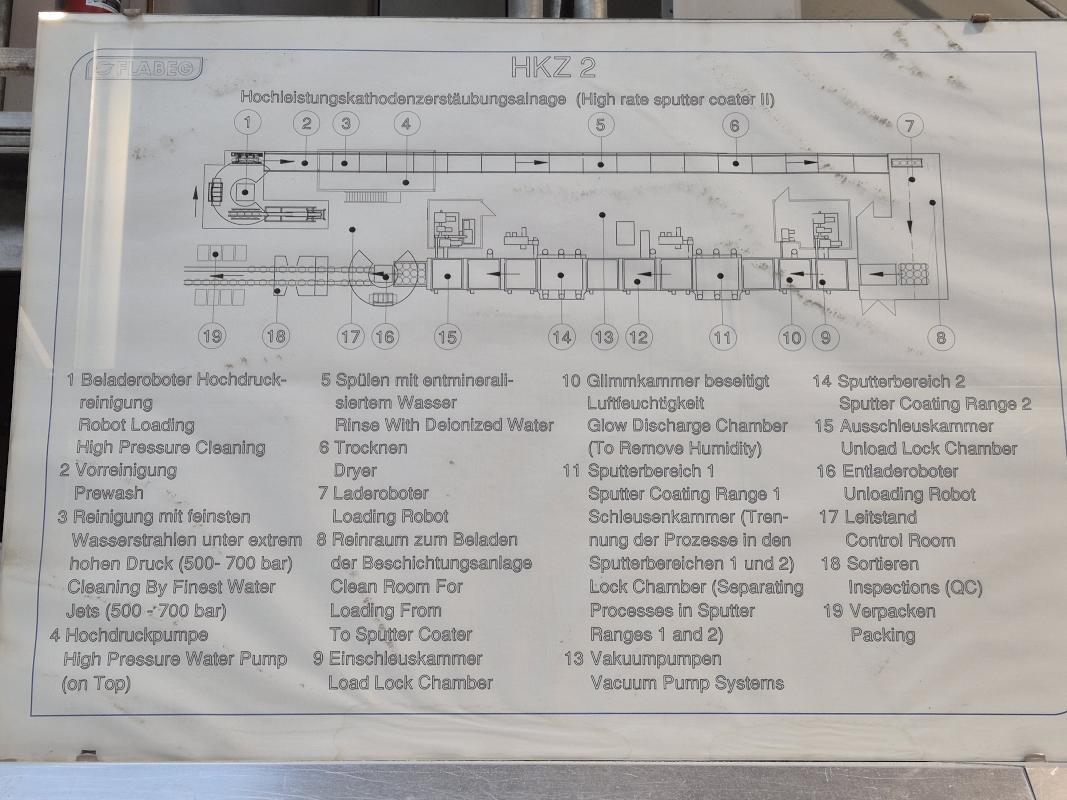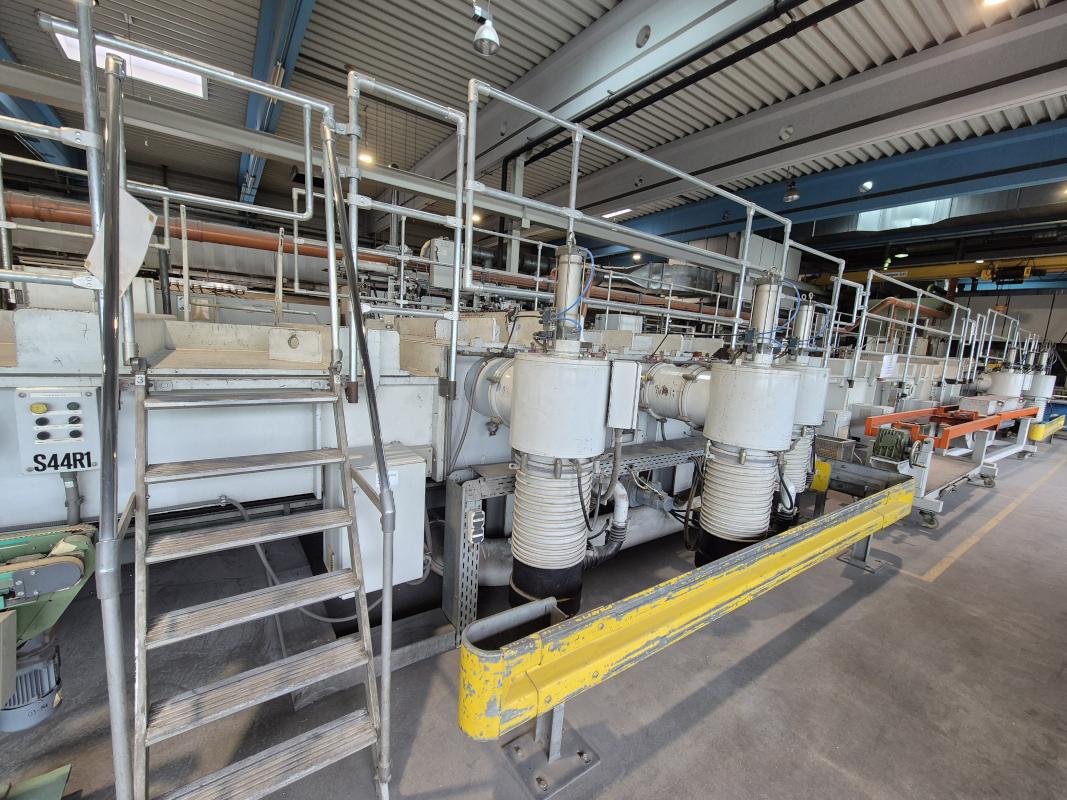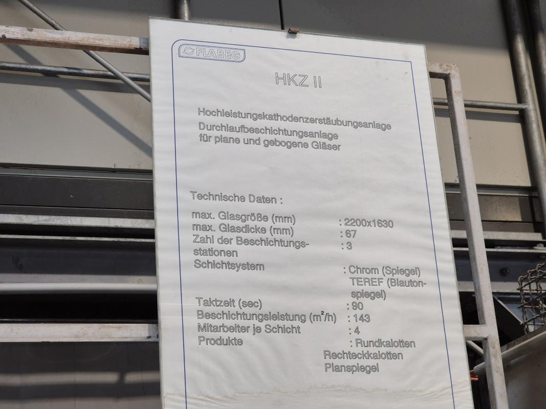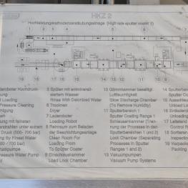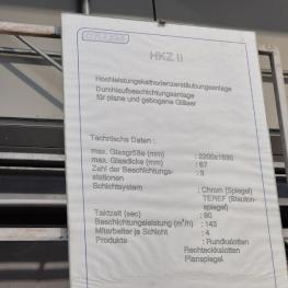 Year of construction: 1993, int. no. 6651, glass size max. approx. 2,200 x 1,630 mm, glass thickness max. approx. 67 mm, total length approx. 35 m, consisting of: Glimmer chamber, 4 transfer chambers, sputter chamber, lock chamber, buffer chamber, high-pressure cleaning, brush cleaning system, 19 chambers, 3 coating stations chrome (mirror), Teref (blue mirror), coating capacity approx. 143 m³/h, switch and control cabinets, system control, glass automation with gantry robot with gripper frame, manufactured by Zollern, year 1994, ser.No. 101, travel distance approx. 11 m, handling robot, with gripper system, year 2005, robot, Yaskawa, type YR-MS-165, year 2016, serial no. R16454-944-3, workpiece automation, lifting tables, accessory units, water treatment system, release agent suction system