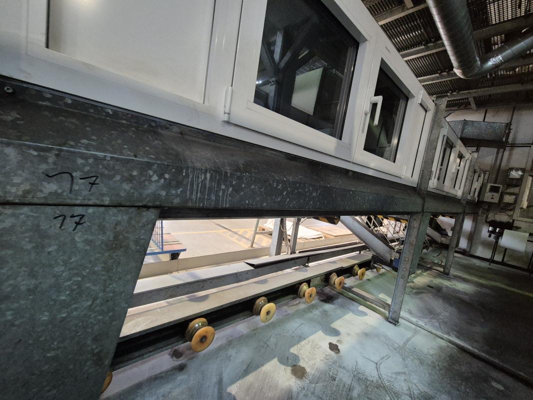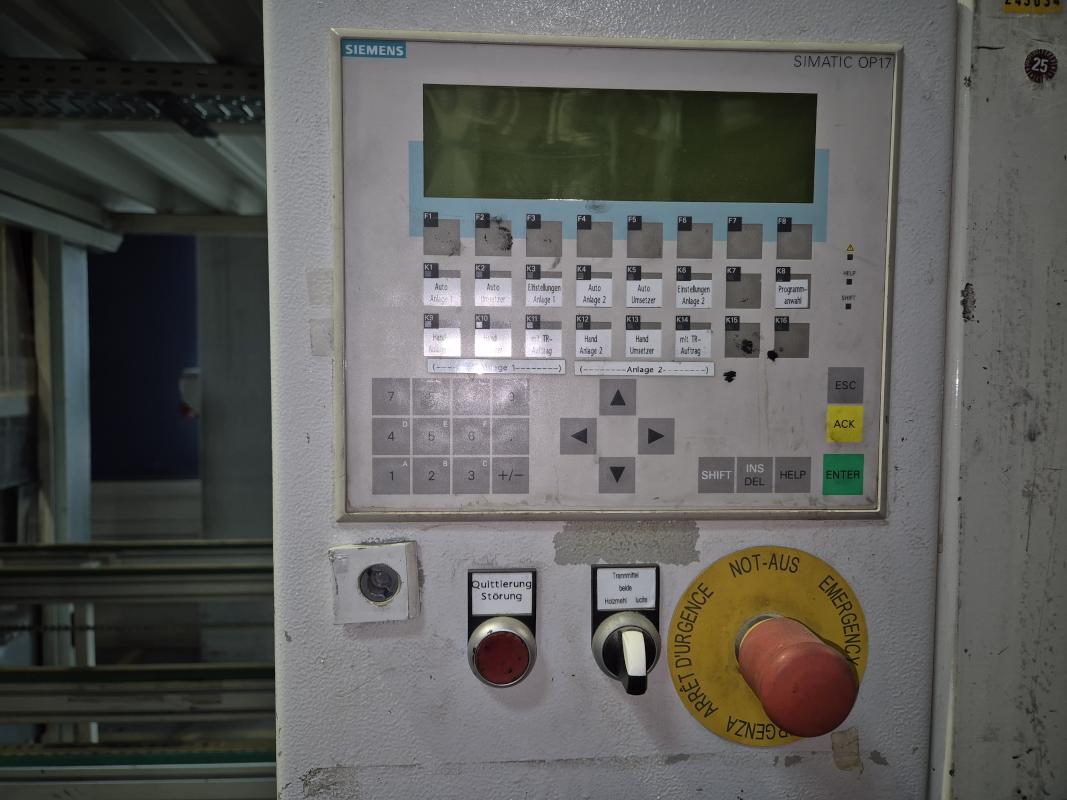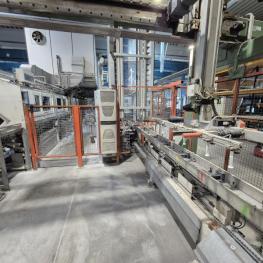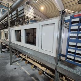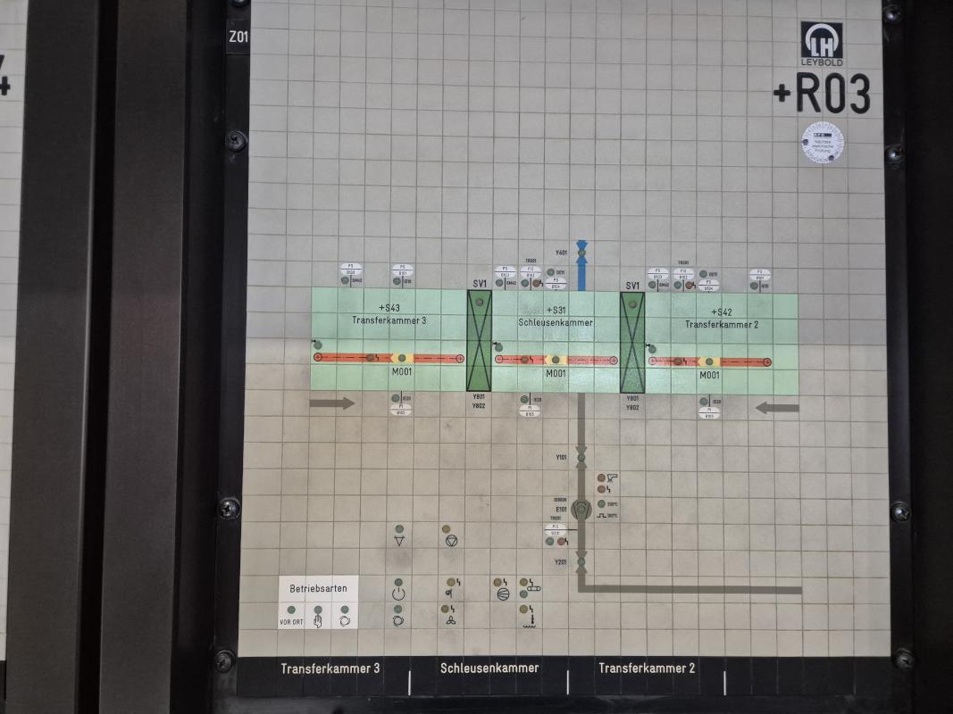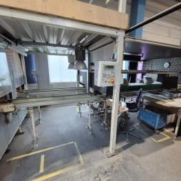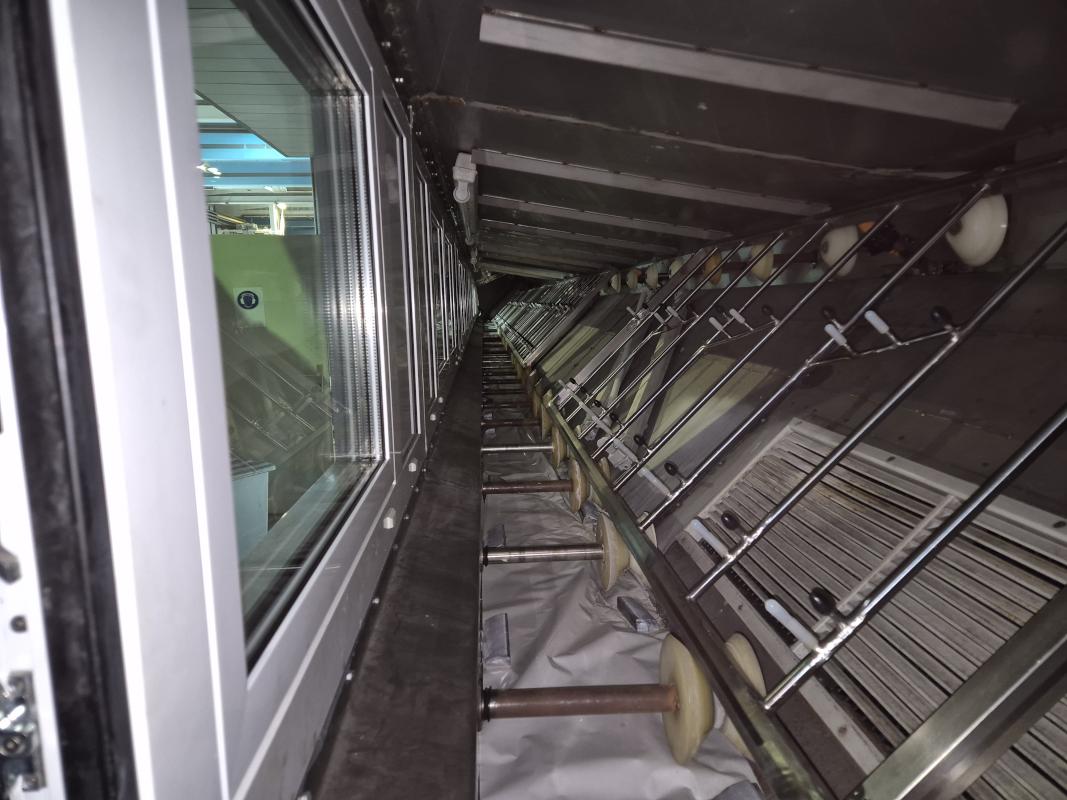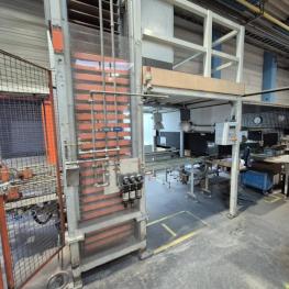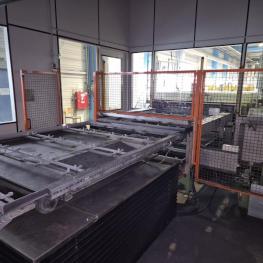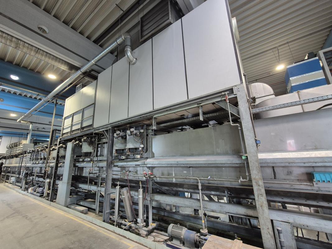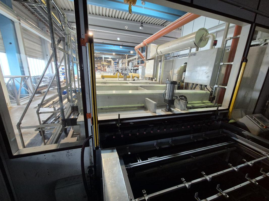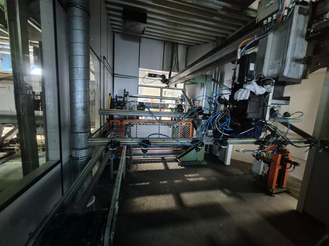 Year of construction: 1993, int. no. 6651, glass size max. approx. 2,200 x 1,630 mm, glass thickness max. approx. 67 mm, total length approx. 35 m, consisting of: Glimmer chamber, 4 transfer chambers, sputter chamber, lock chamber, buffer chamber, high-pressure cleaning, brush cleaning system, 19 chambers, 3 coating stations chrome (mirror), Teref (blue mirror), coating capacity approx. 143 m³/h, switch and control cabinets, system control, glass automation with gantry robot with gripper frame, manufactured by Zollern, year 1994, ser.No. 101, travel distance approx. 11 m, handling robot, with gripper system, year 2005, robot, Yaskawa, type YR-MS-165, year 2016, serial no. R16454-944-3, workpiece automation, lifting tables, accessory units, water treatment system, release agent suction system