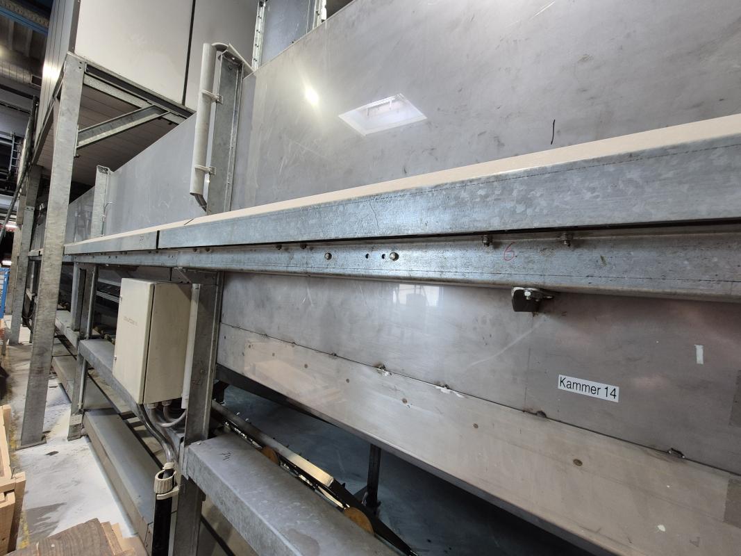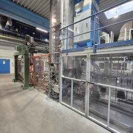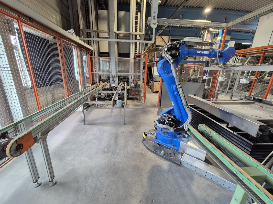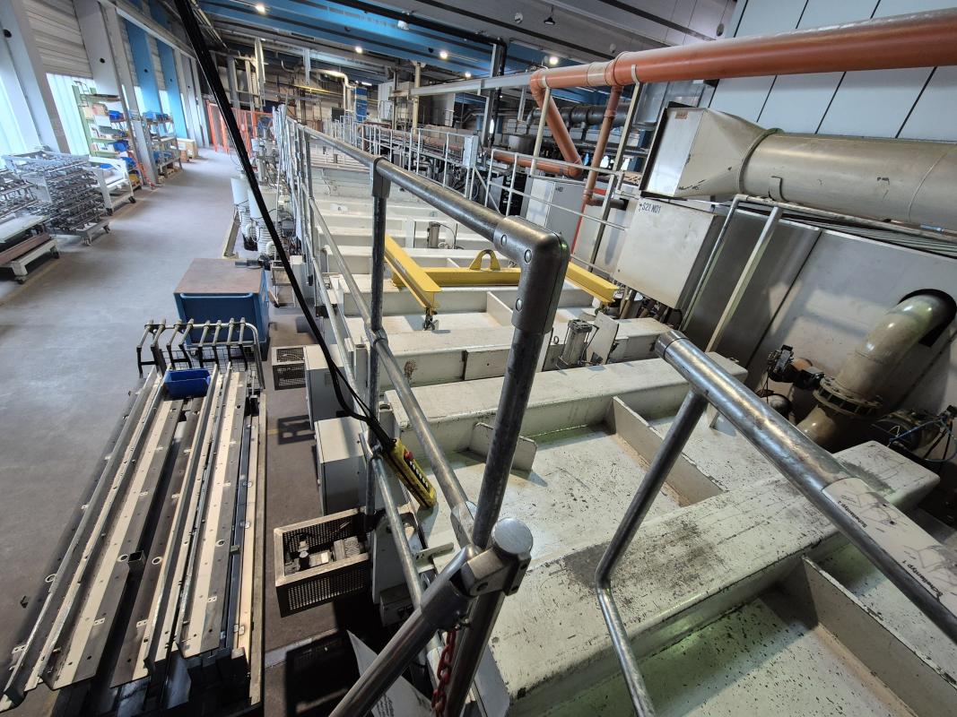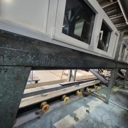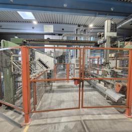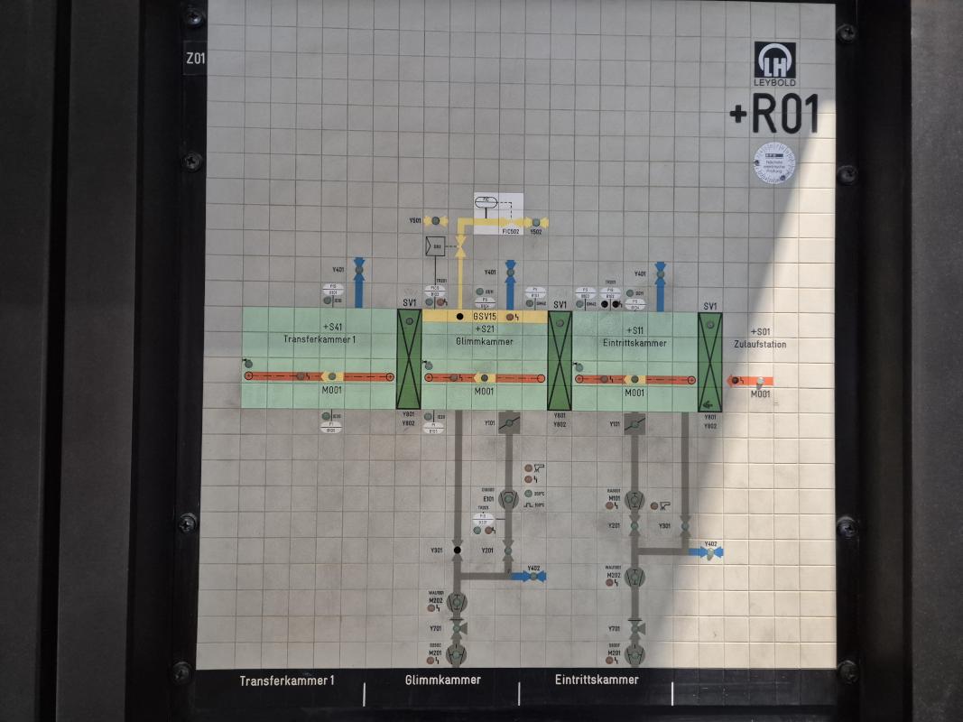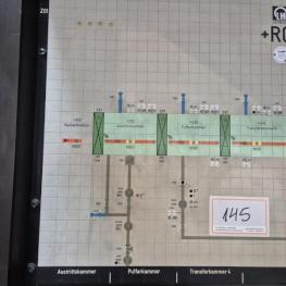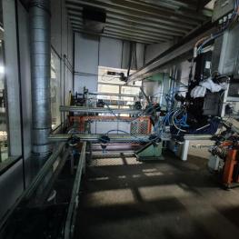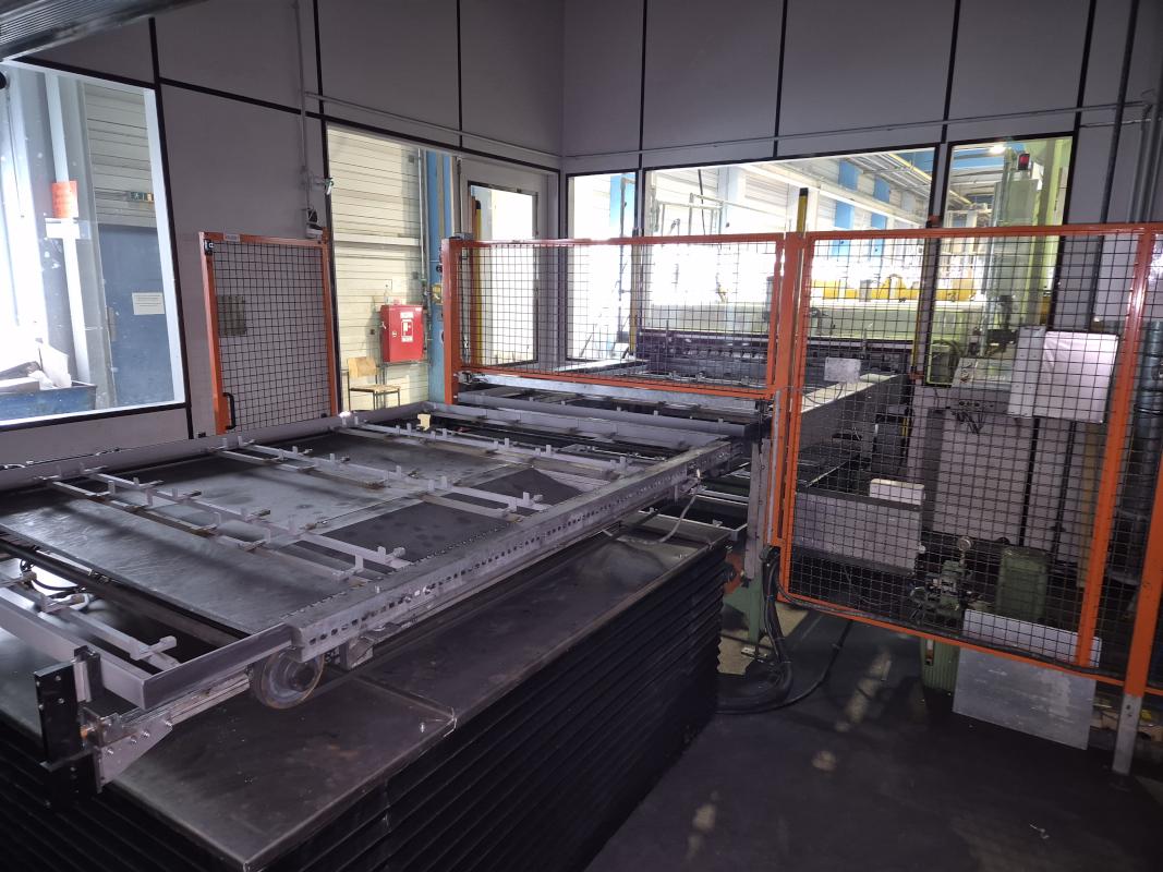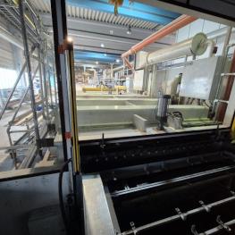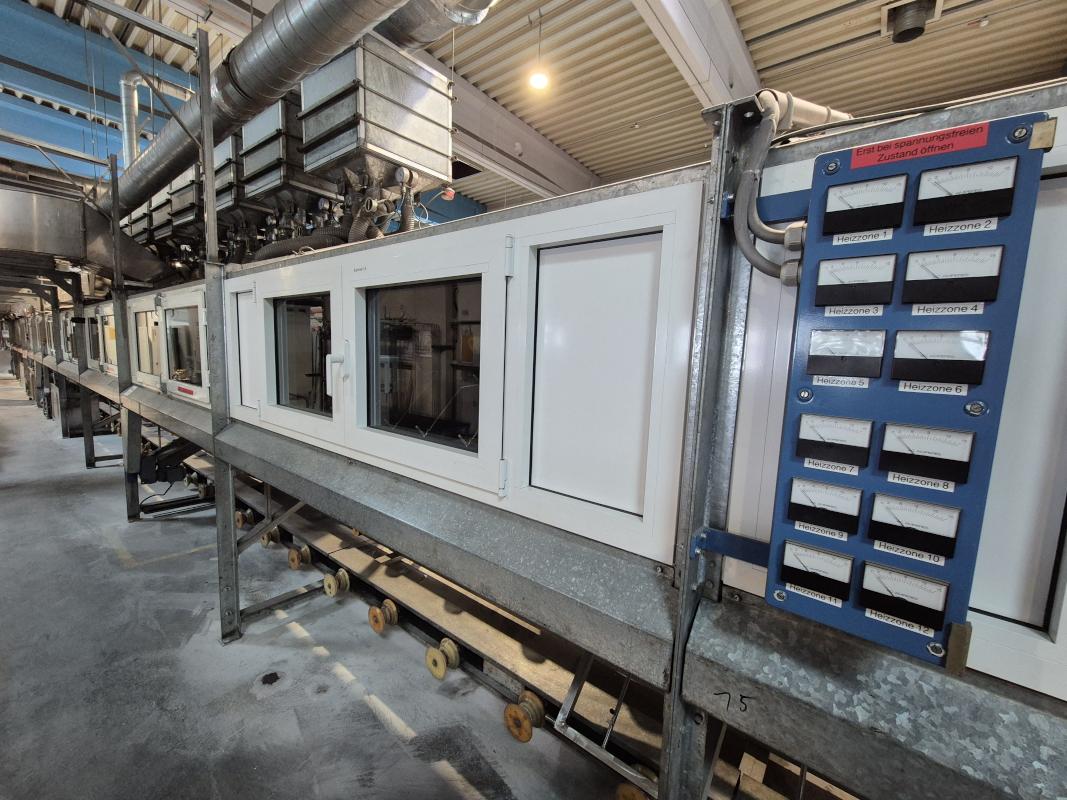 Year of construction: 1993, int. no. 6651, glass size max. approx. 2,200 x 1,630 mm, glass thickness max. approx. 67 mm, total length approx. 35 m, consisting of: Glimmer chamber, 4 transfer chambers, sputter chamber, lock chamber, buffer chamber, high-pressure cleaning, brush cleaning system, 19 chambers, 3 coating stations chrome (mirror), Teref (blue mirror), coating capacity approx. 143 m³/h, switch and control cabinets, system control, glass automation with gantry robot with gripper frame, manufactured by Zollern, year 1994, ser.No. 101, travel distance approx. 11 m, handling robot, with gripper system, year 2005, robot, Yaskawa, type YR-MS-165, year 2016, serial no. R16454-944-3, workpiece automation, lifting tables, accessory units, water treatment system, release agent suction system
