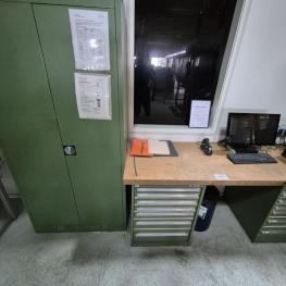 Make: HERMLE, Machine no. 8153, switch cabinet, control unit, Heidenhain, compact inverter type UE112, steel cabinet, 2-door, workbench, Garant with 2x telescopic pull-out cabinet with 7 pull-outs, contents: various machine accessories for peripheral grinding machine, manual seaming system