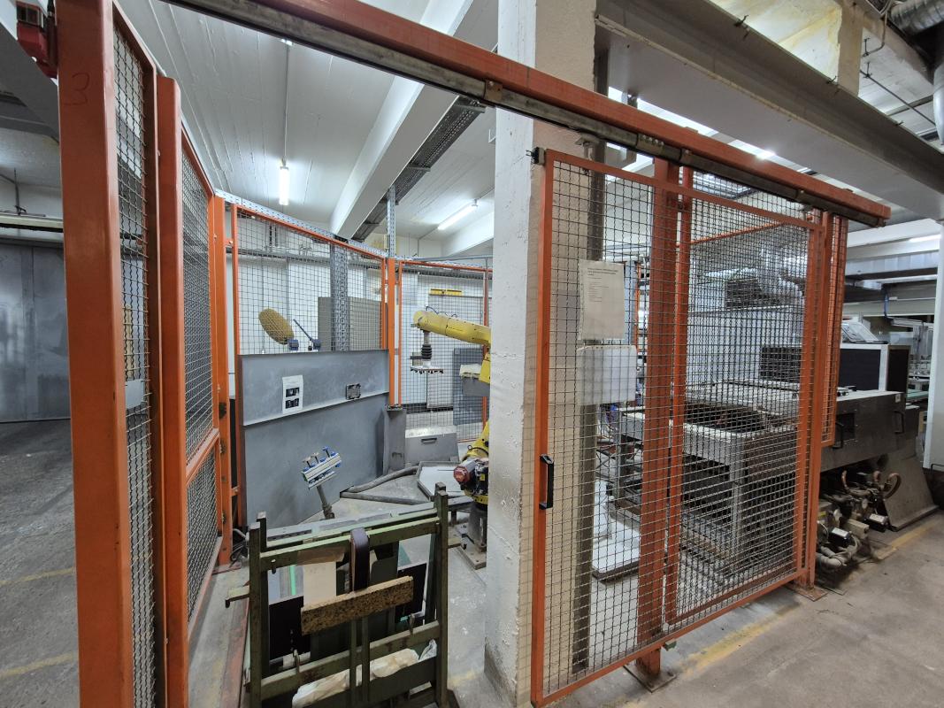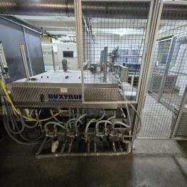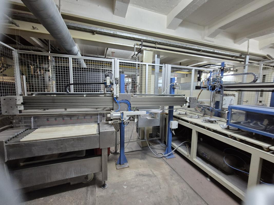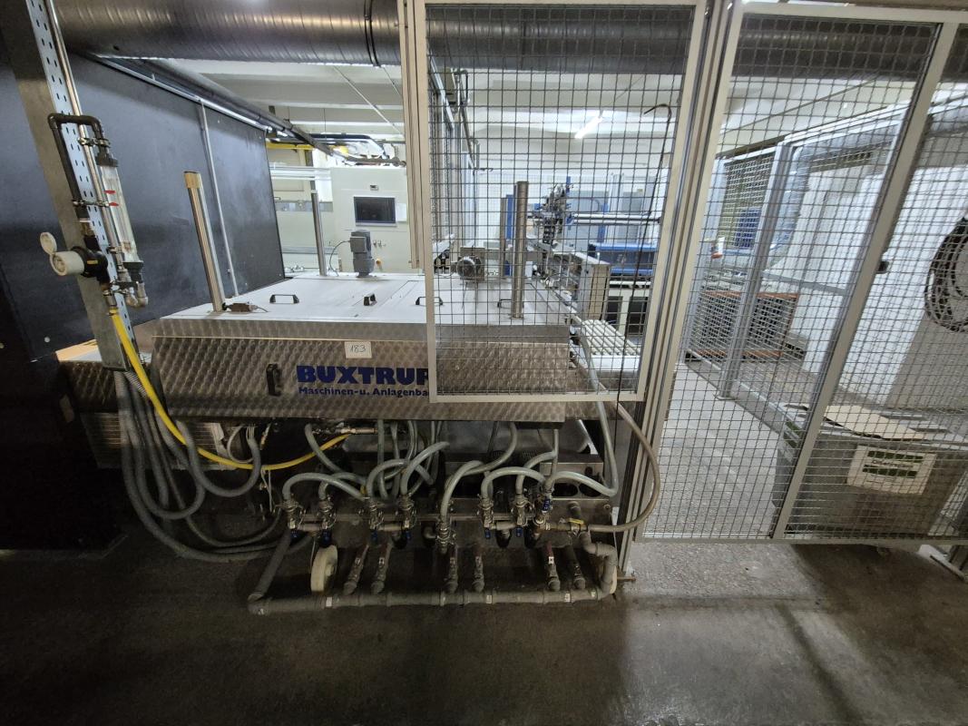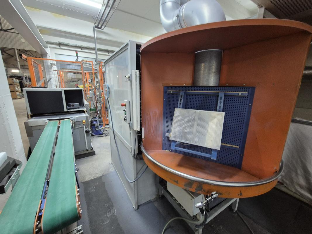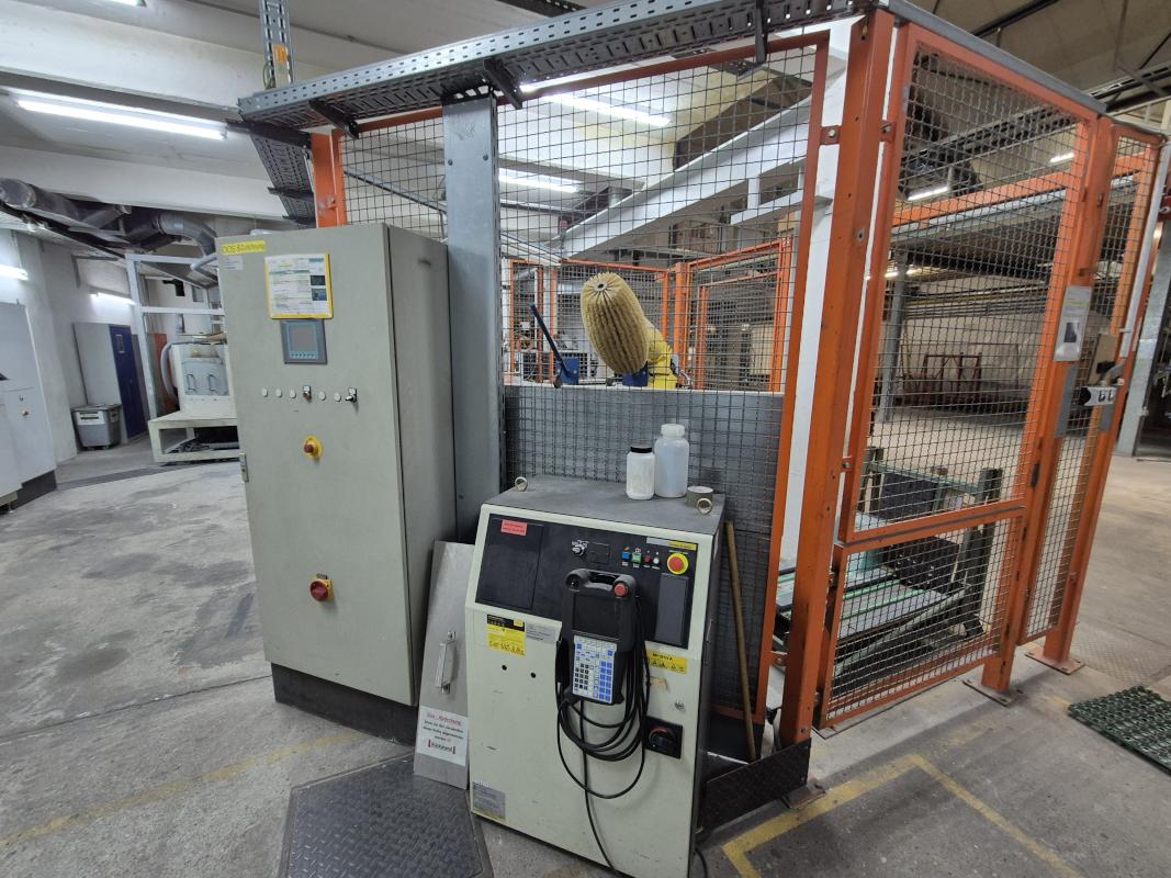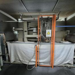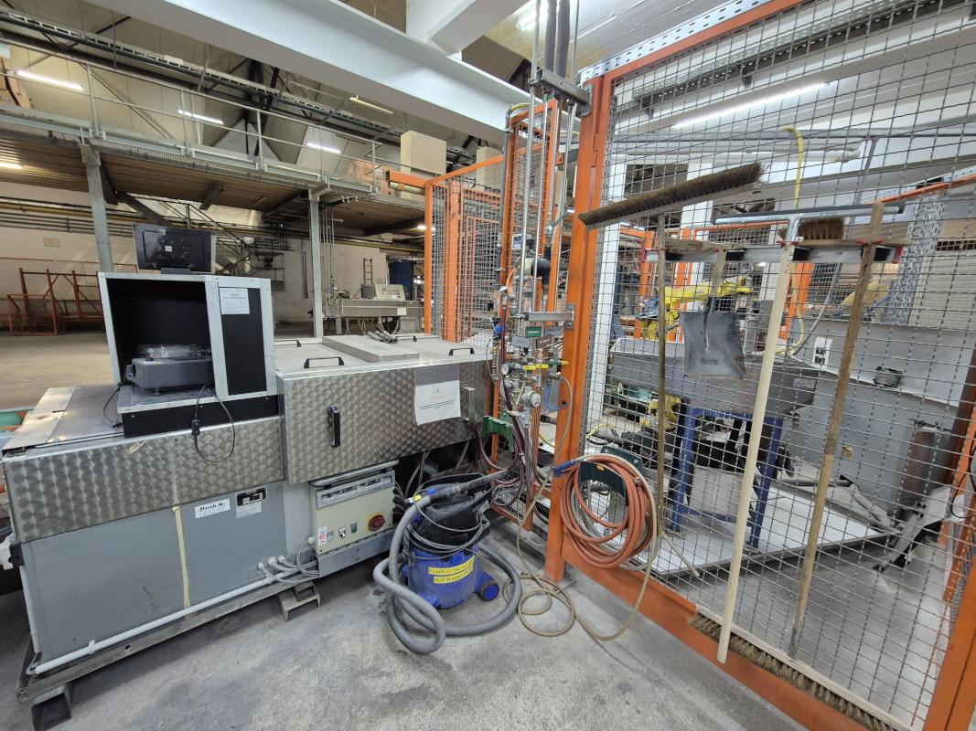 consisting of: Robot, Fanuc M-20IA, robot control R-30iA, 1 seaming station, 1 Buxtrup WH800-5-130 continuous washing machine, year of manufacture: 2006, serial no. 300514, throughput width 800 mm, Quallyspray release agent applicator, mould cleaning, continuous furnace, with 30 mould slides, approx. 100 bending moulds, circulating cooling belt, cleaning and blow-off station, automation, test cabin