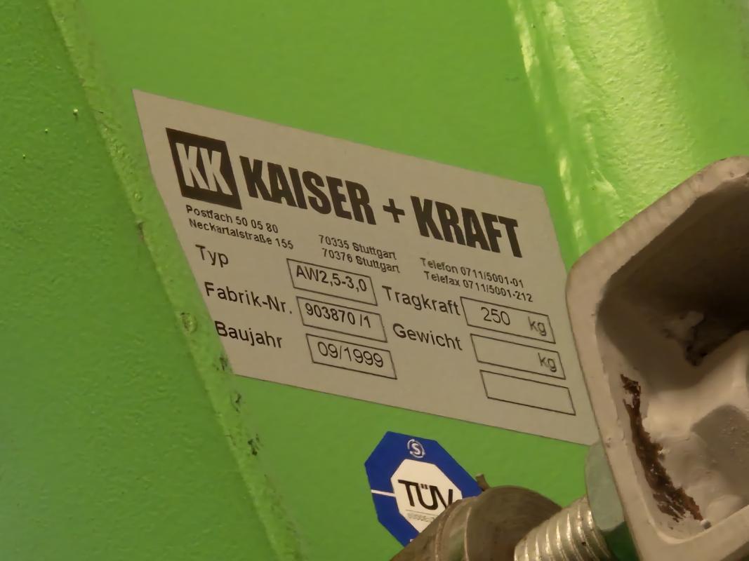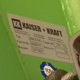 Make: KAISER + KRAFT, Model: AW2,5-3,0, Year of construction: 1999, Prod. no. 903870/1, max. load capacity 250 kg, electric chain hoist, jib length approx. 3,000 mm