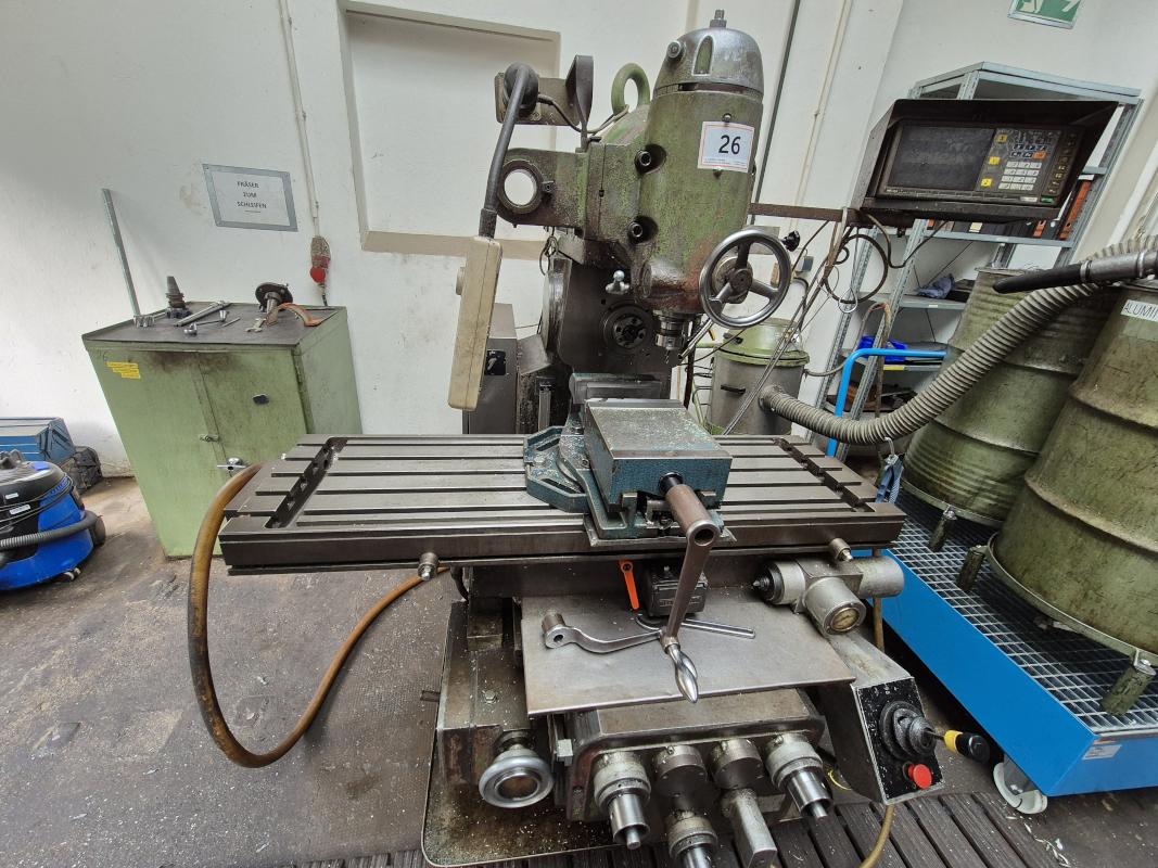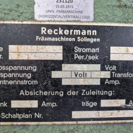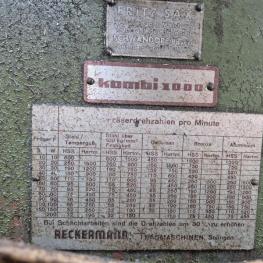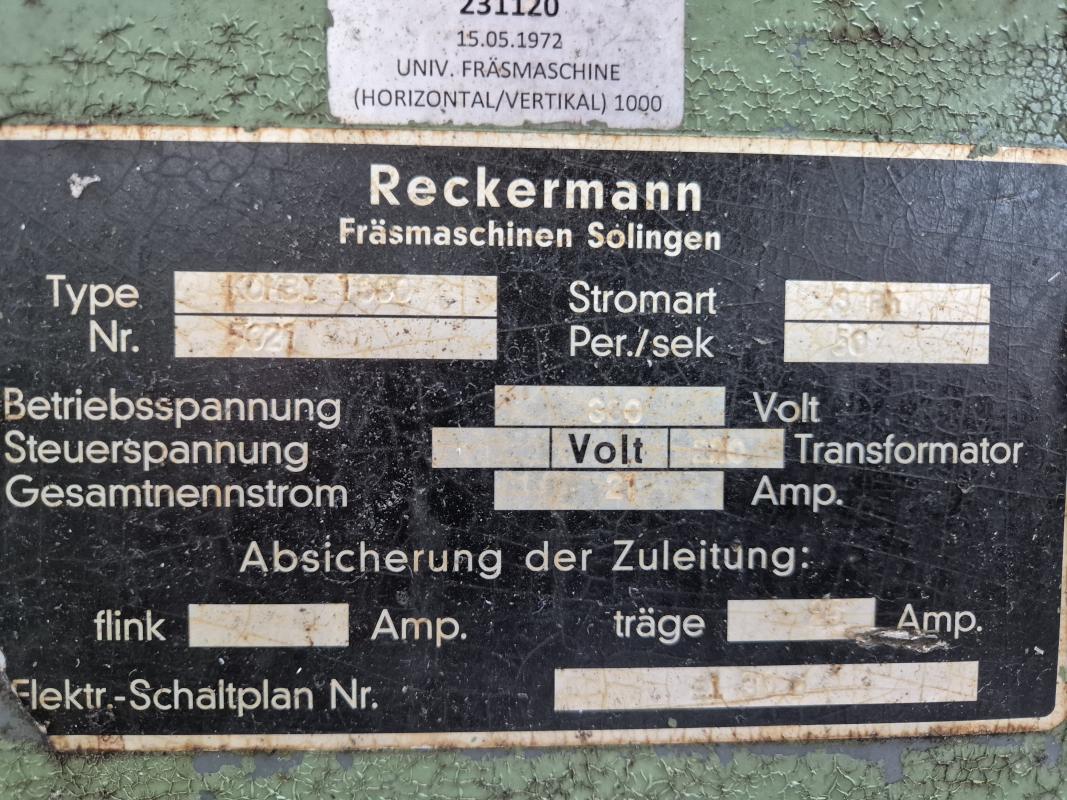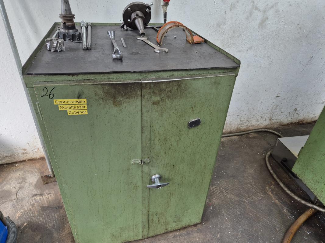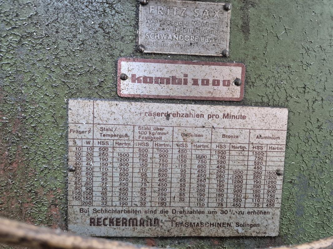 Make: RECKERMANN, Model: Kombi 1000, Ser. no. 5021, max. speed 2,800 rpm, tool holder SK 40, table approx. 1,300 x 400 mm, 5 grooves, horizontal / vertical, milling head, 3-axis digital display, Mitutoyo, machine vice, jaw width 200 mm, with quick adjustment, storage cabinet, metal, 2-door, contents: various accessories