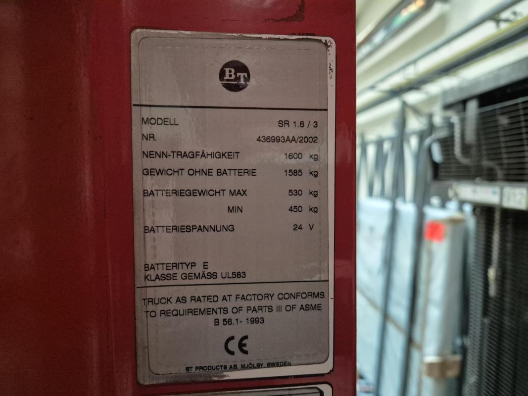 Make: BT, Model: BT1.6/3, Year of construction: 2002, Ser. no. 436993AA, operating hours 4,973, duplex mast, load capacity 1,600 kg, max. lift height 6,300 mm, incl. charger