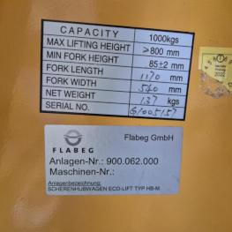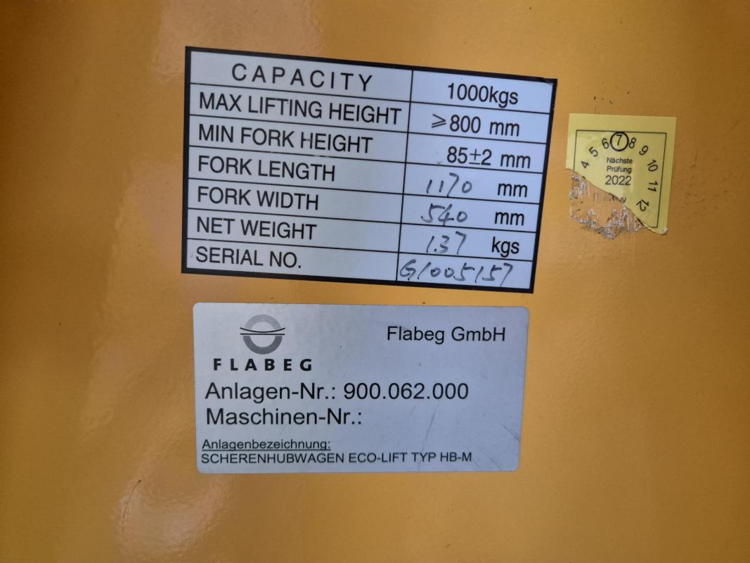 Make: ECO-LIFT, Model: HB-M, Serial no. G1005157, max. load capacity 1,000 kg, max. lifting height 800 mm, fork length 1,150 mm
