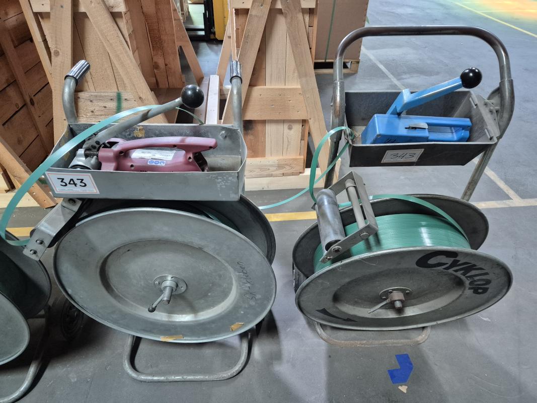 2x battery-powered tensioning and sealing pliers, plastic strap dispenser