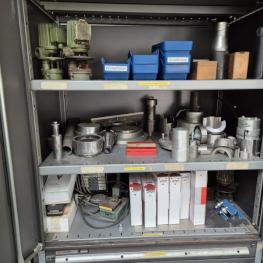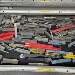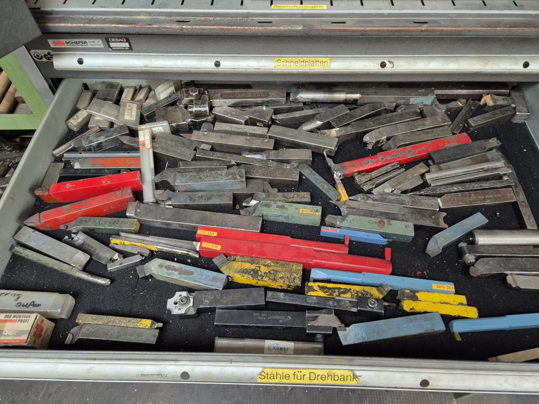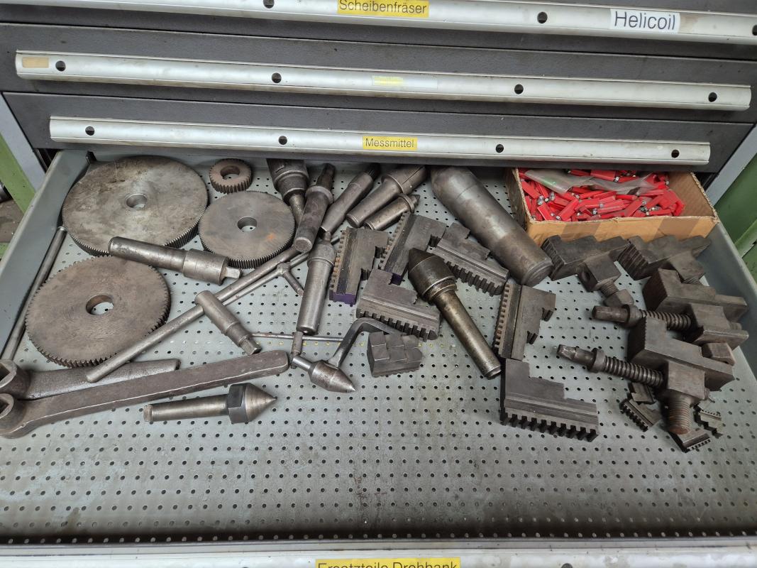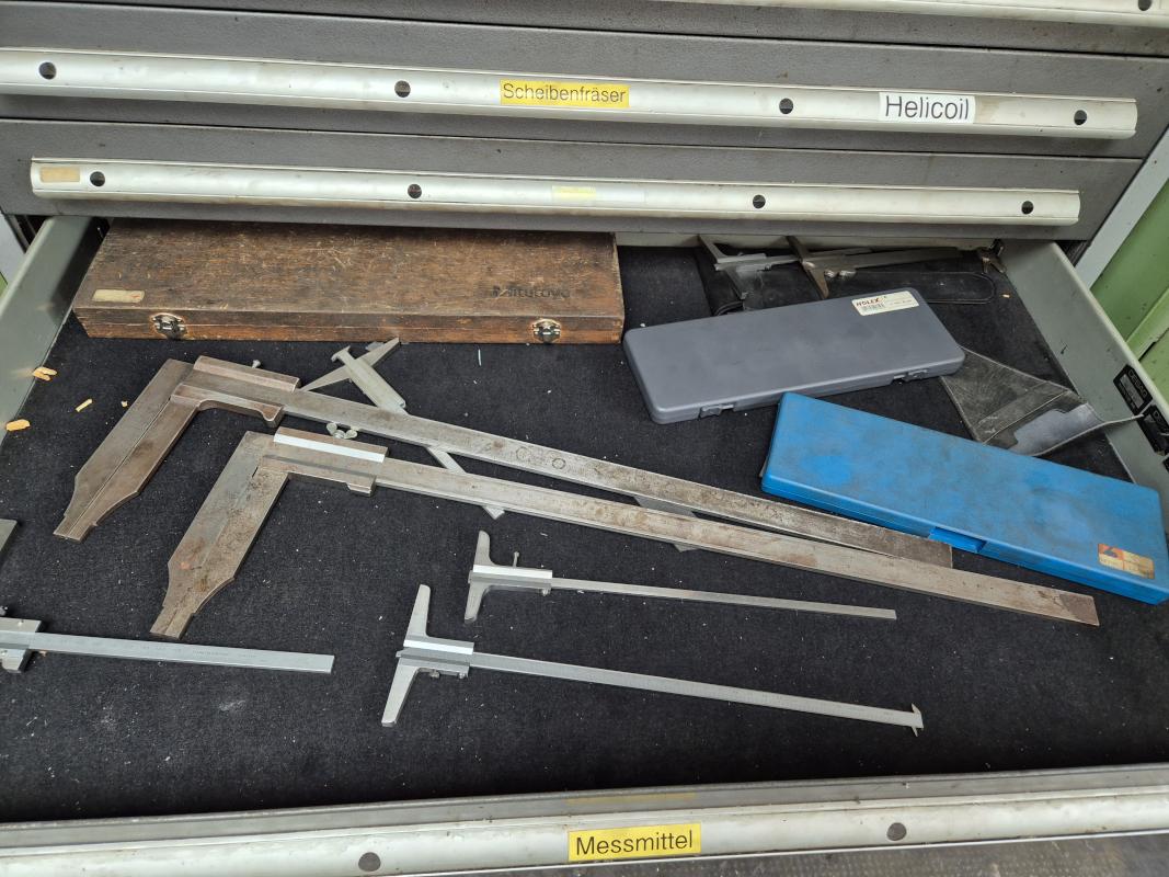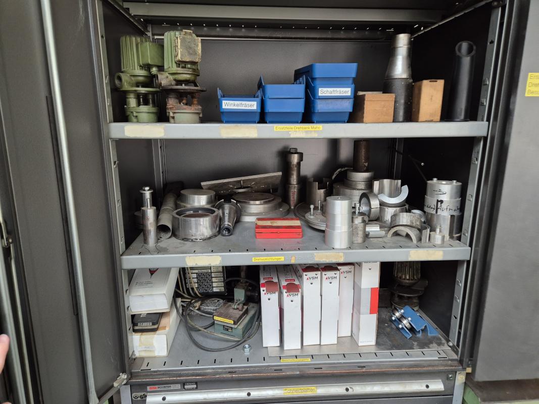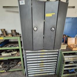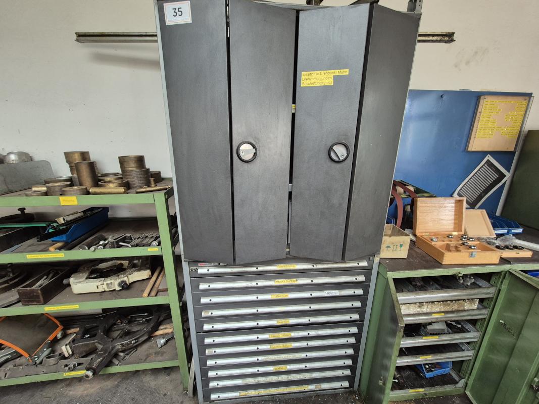 Metal, 2-door and drawers, 10 pull-outs, approx. 1,000 x 600 x 2,000 mm, contents: various measuring equipment, turning tools, milling cutters