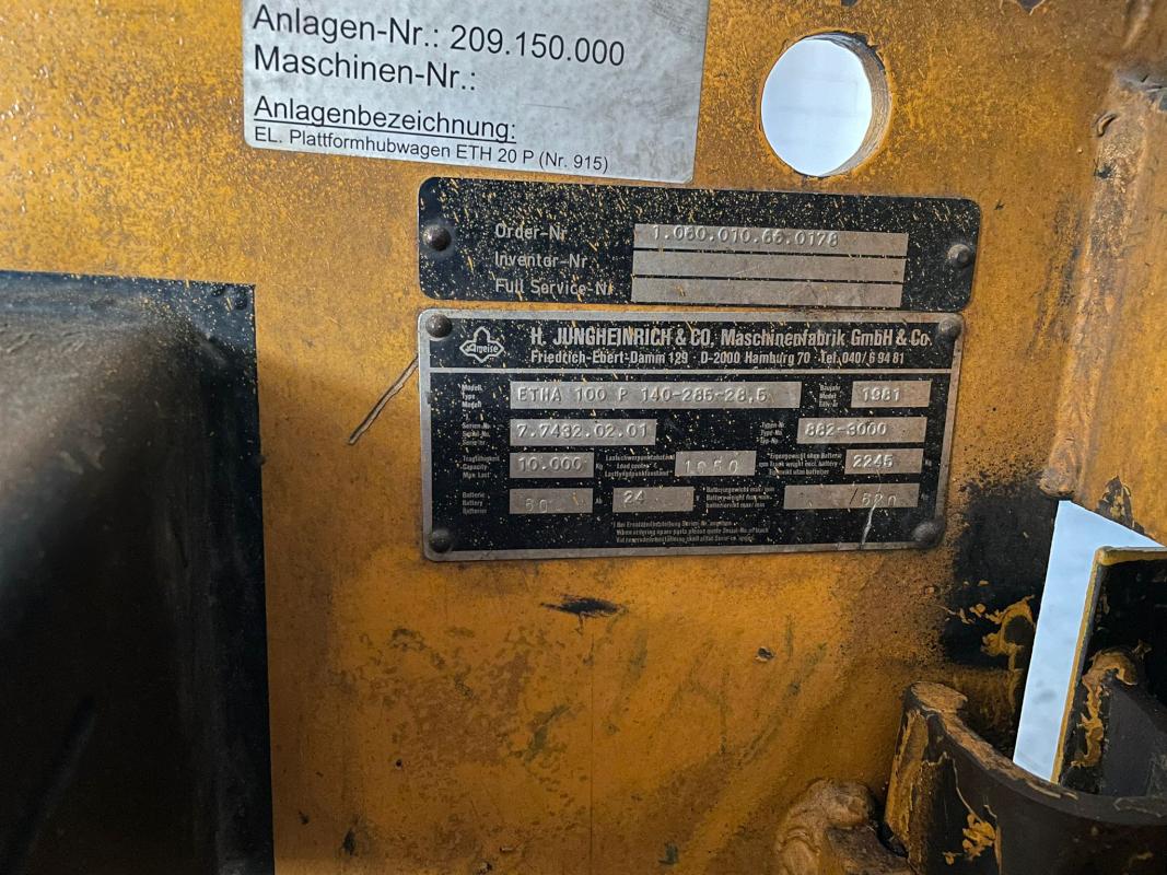Make: JUNGHEINRICH, Model: ETHA 100 P 140-285-28.5, Year of construction: 1981, Max. load capacity 10,000 kg, platform length approx. 2,800 mm, incl. charger