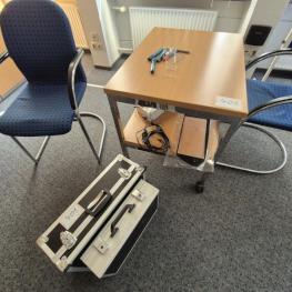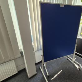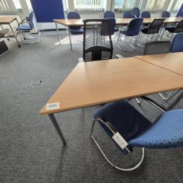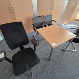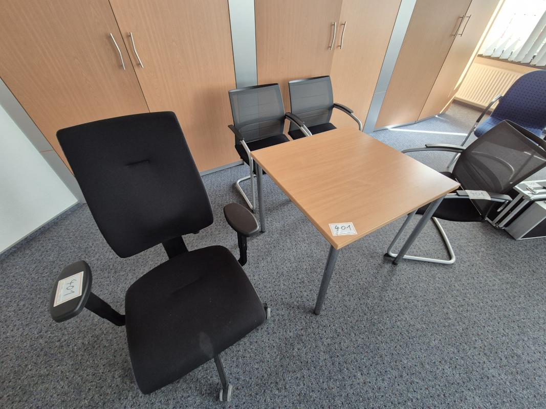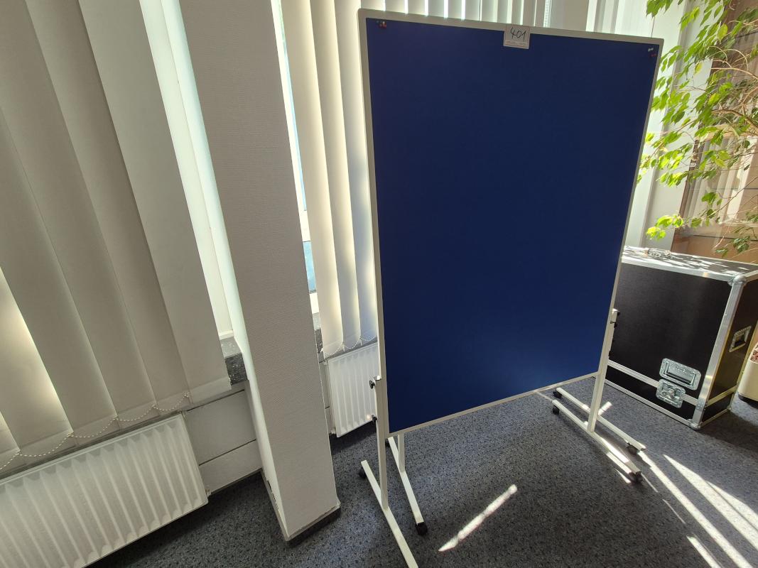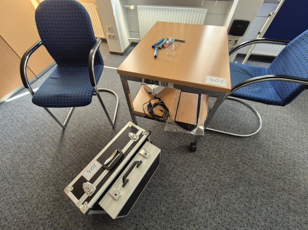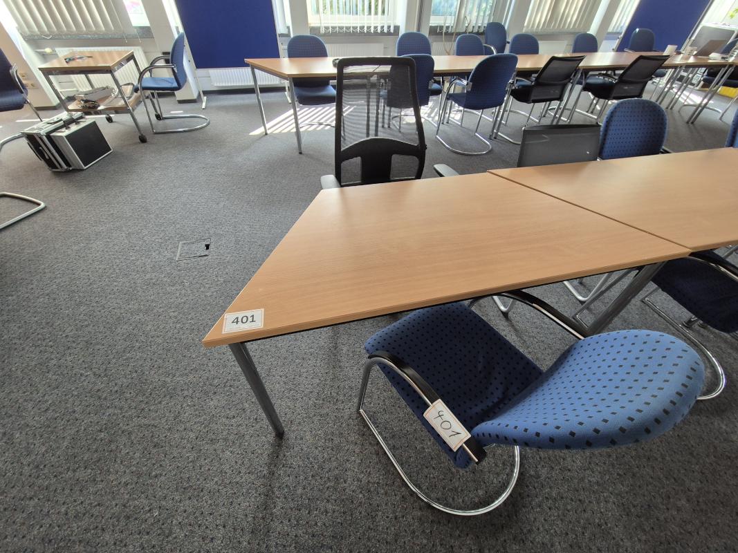 Meeting table L/W/ 2,400 x 700 mm, 14-section, 2 side tables 800 x 800 mm, coat rack, 2 mobile pin boards, 6 office chairs, 38 cantilever chairs black / blue with armrests, 1 mobile table with base, 2 presentation cases