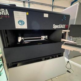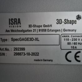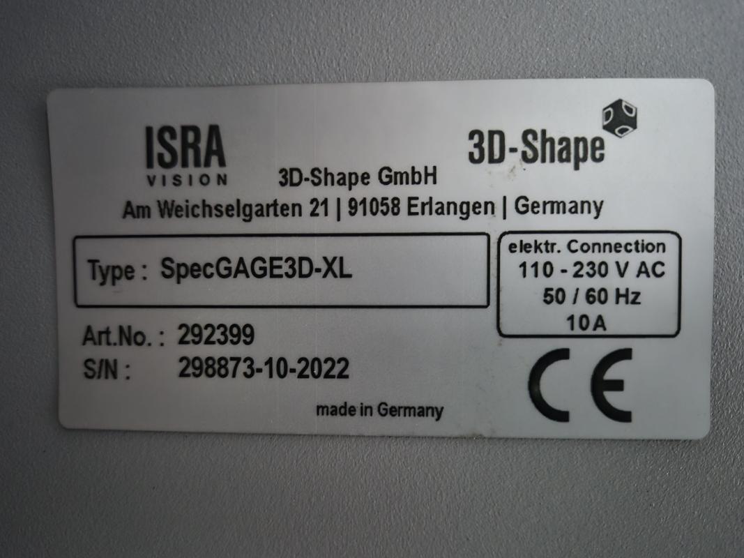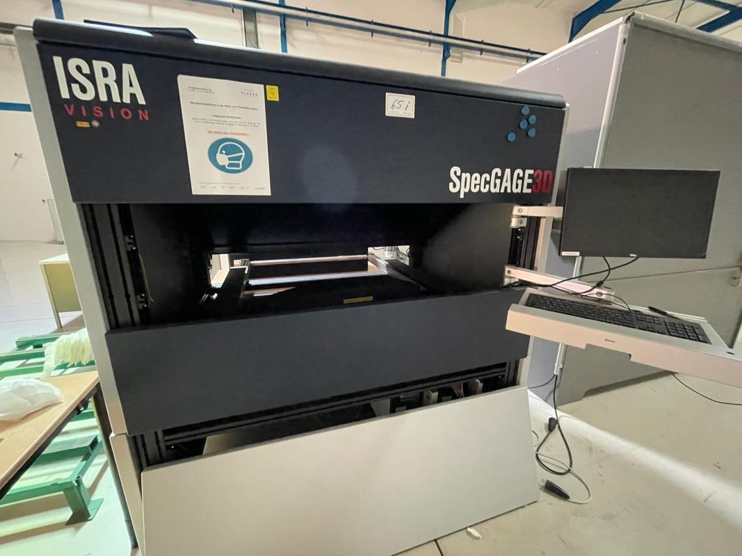 Make: ISRA VISION, Model: SpecGAGE 3D, Year of construction: 2022, Serial No. 298873-10, visual inspection station, width approx. 2,200 mm, curvature measuring device, measuring field approx. 300 x 200 mm², measuring time 3-15 seconds, 2x computers, ThinClient, 2x 24" TFT monitors, Iiyama, 2x keyboards, 2x mice, Zebra label printer, type ZD621, handheld scanner
