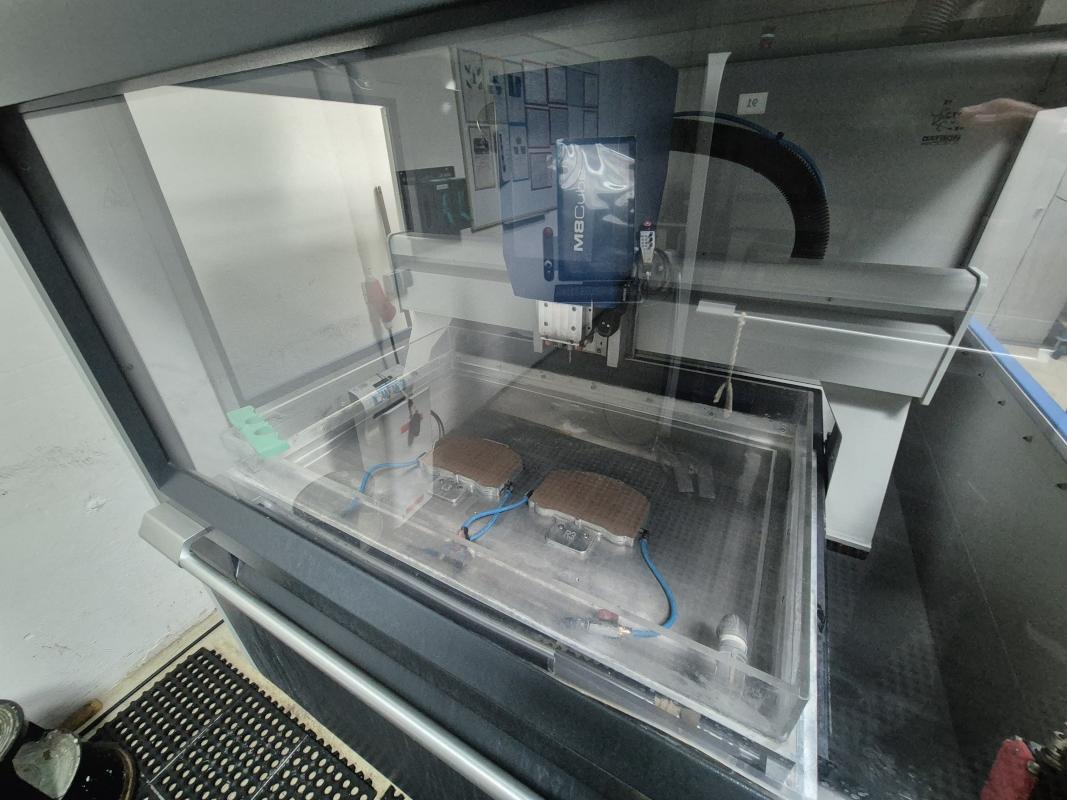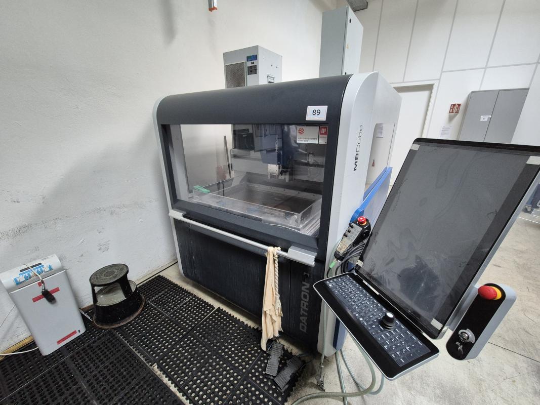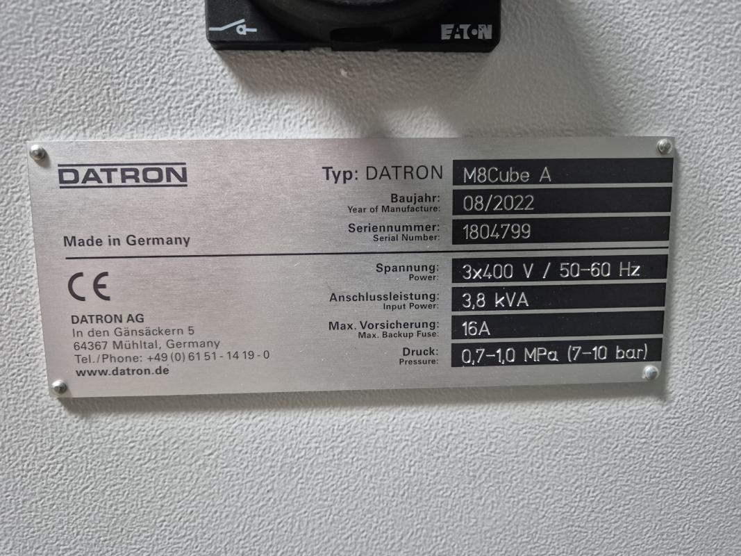 Make: DATRON, Model: M8Cube A Edition, Year of construction: 2022, Serial no. 1804799, Datron next control unit, 23" Touch Dispalay, CNC manual operating unit B10-2, travel X / Y / Z 1,020 x 830 x 245 mm, X/Y/Z sensor, HF spindle with cooling unit, spindle speed max. 48,000 rpm, HSK-E 25 tool holder, 5-station magazine, Heidenhain TT 160 tool length measuring probe, vacuum table feed-through, 2 vacuum clamping stations, cooling unit, cabin, steel cabinet 1,000 x 400 x 1,900 mm