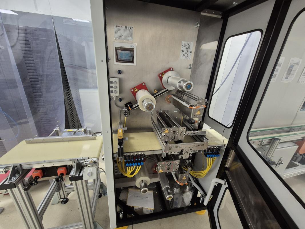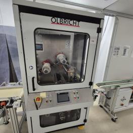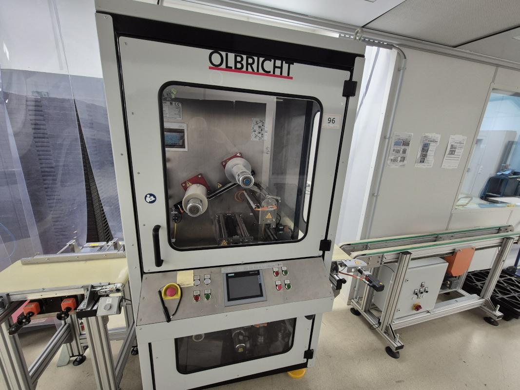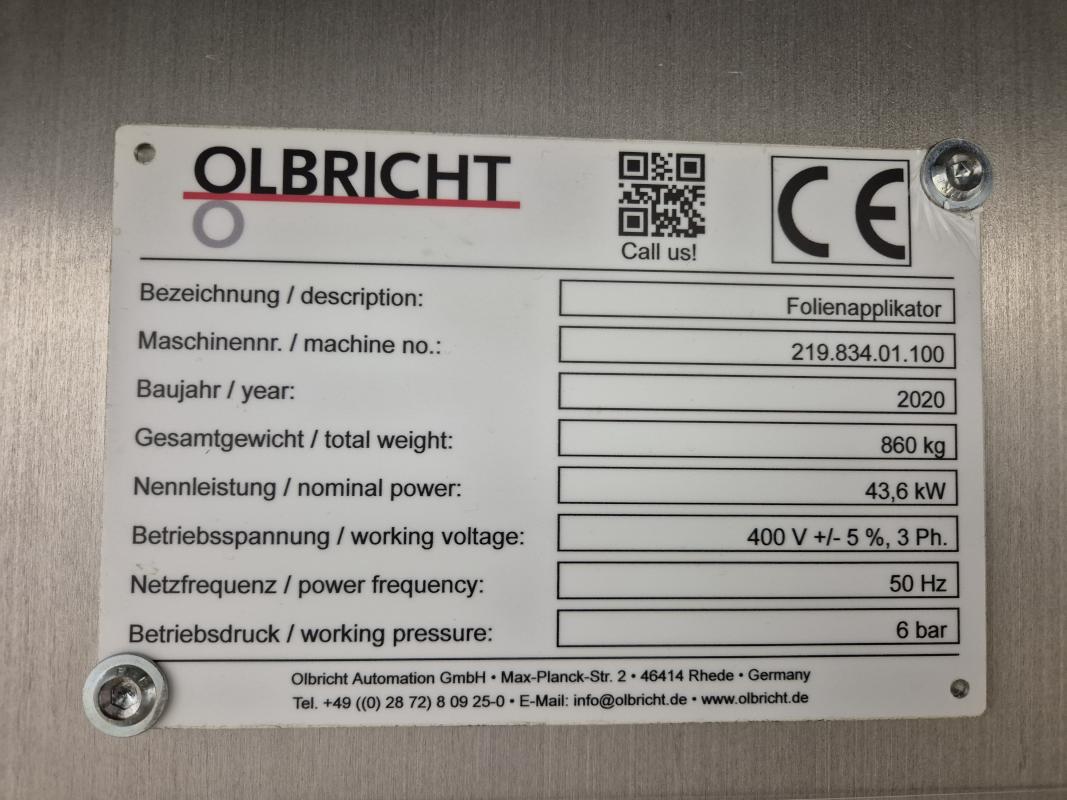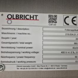 Make: OLBRICHT, Year of construction: 2020, Ser. no. 219.834.01.100, control system, Siemens, Simatic HMI Touch display, rated output 43.6 kW, film width approx. 300 mm, belt conveyor, W approx. 300 mm, output belt conveyor, L approx. 2,000 mm, manual stacking
