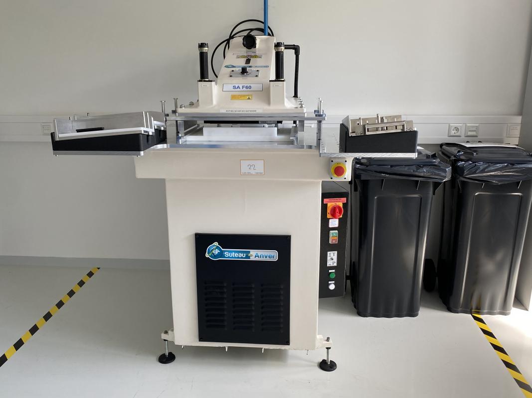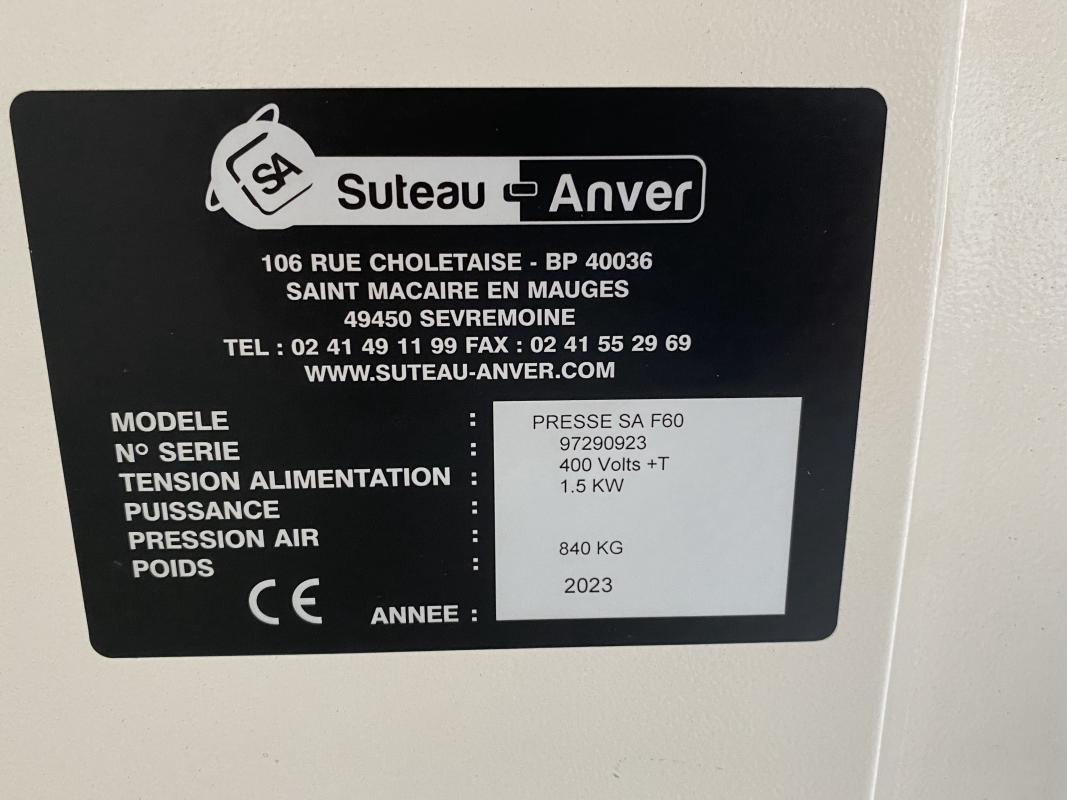 Make: SUTEAU ANVER, Model: SA F60, Year of construction: 2023, S/N 97290923, Voltage 400 V/1.5 kW, Press force 840 kg, approx. 1,200 x 1,200 x 1,600 mm