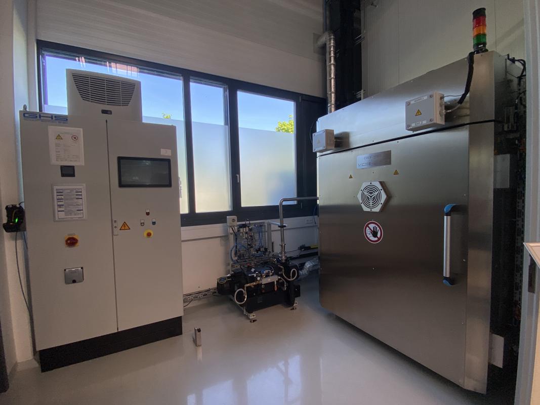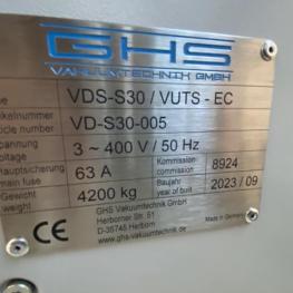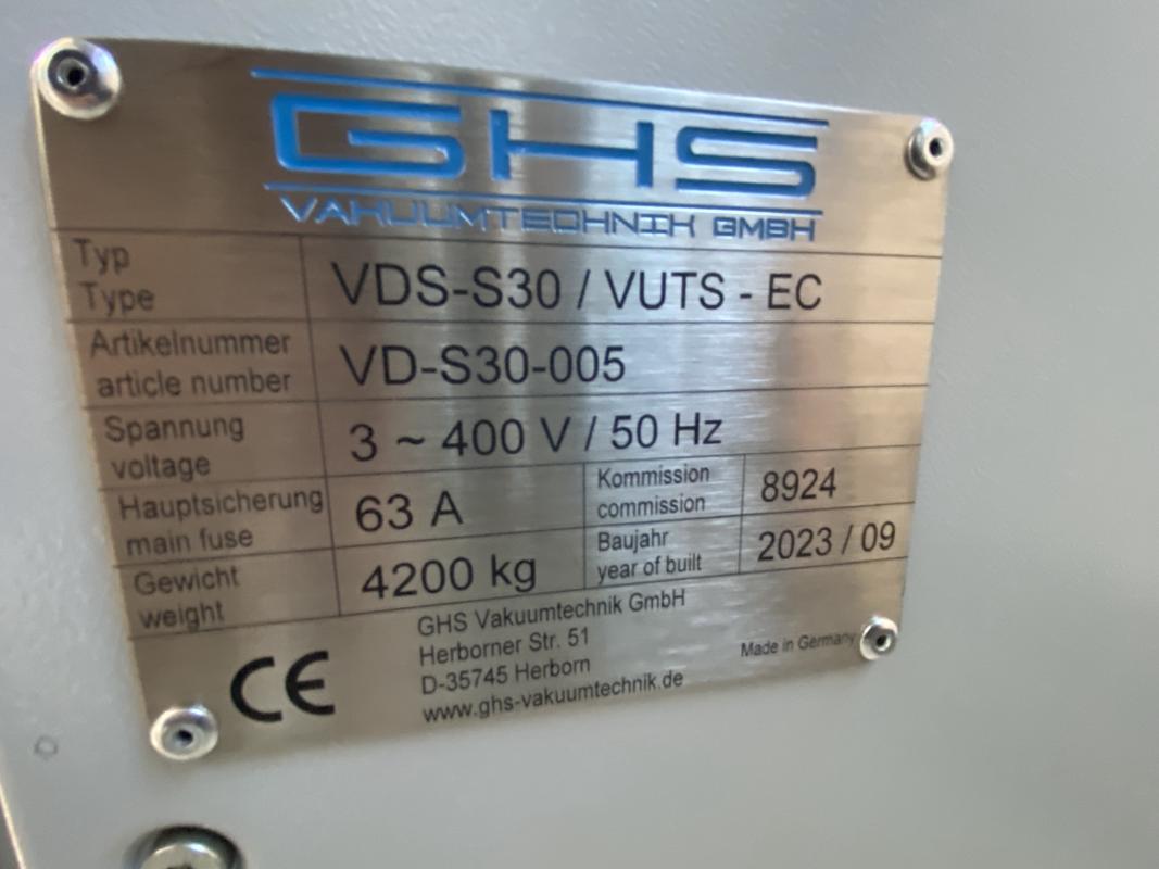 Make: GHS, Model: VDS-S30/VUTS-EC, Year of construction: 2023, S/N VD-S30-005, 2 doors (lock function), chamber size 1,200 x 1,400 x 1,500 mm, max. temperature 200°C, switch and control cabinet, PLC control, touch display, accessory units