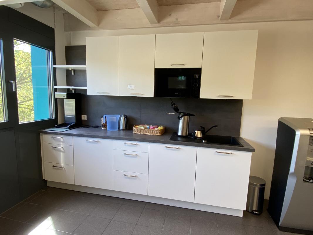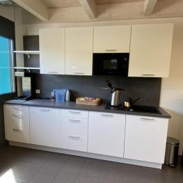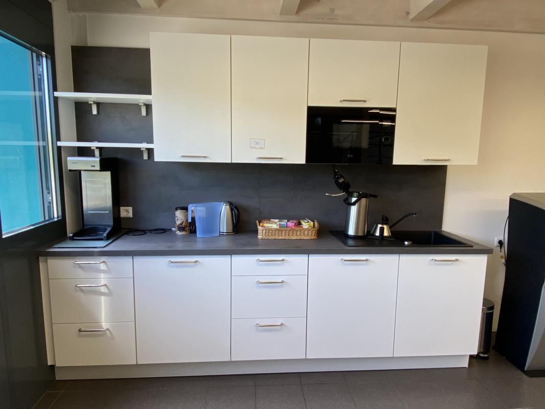Length approx. 2,900 mm, gray worktop, white front, consisting of 3 base cabinets with 6 drawers and 3 door units, 4 wall cabinets, Miele dishwasher, AEG refrigerator, AEG microwave, sink with single-lever mixer tap