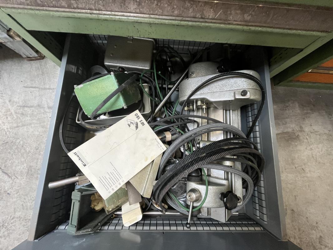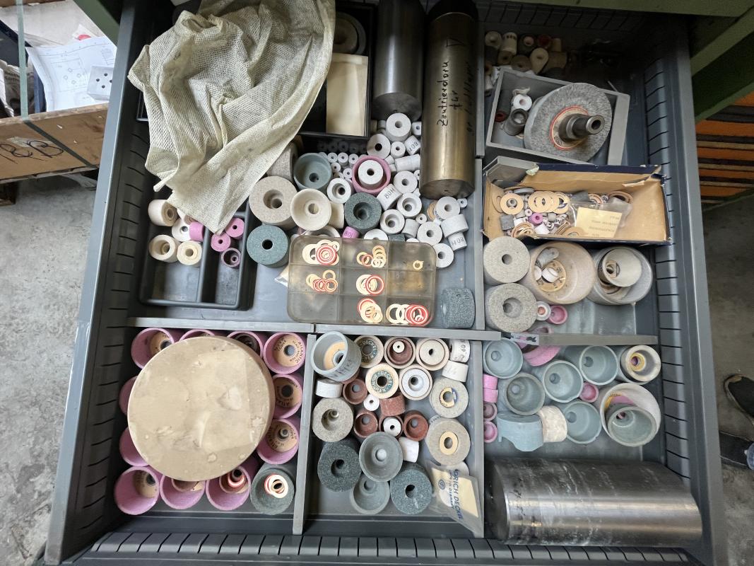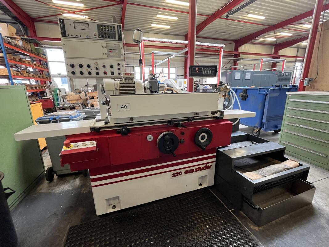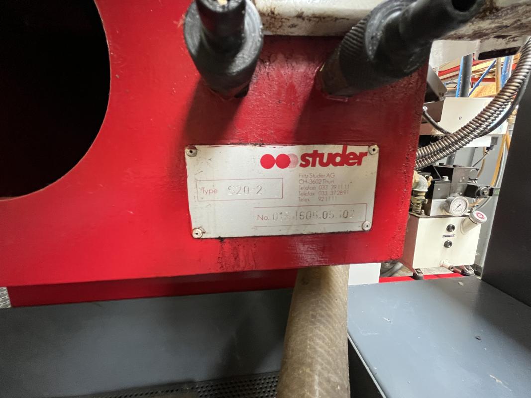 Make: STUDER, Model: S20-2, Year of construction: 2002, Serial no. 015.1605.05.102, center height/width 100 mm / 450 mm, grinding length 450 mm, max. speed 3,500 mm/min, max. feed rate 1.5 mm/min, 2 handwheels, max. speed 2,200 rpm, tailstock, MT2 tool holder, 20 mm spindle travel, belt filter system, work light, measuring control, manufacturer Mapos, type E5, telescopic drawer cabinet, 6 drawers, contents: mandrel bars, grinding stones, plug gauge set