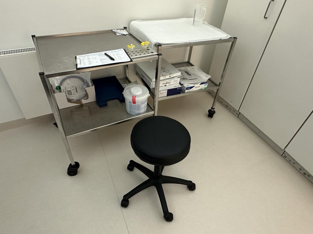 Stainless steel, 2 levels each, dimensions approx. 800 x 800 mm, rolling stool, empty