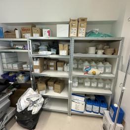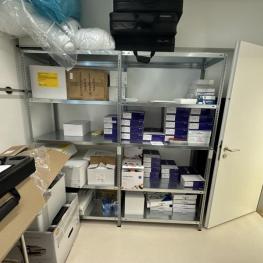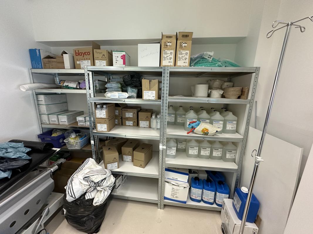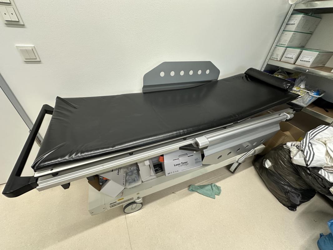 consisting of: 3 metal shelves, plug-in system, W 800 mm each, 2-piece metal shelf unit, W 1,000 mm each, 5 levels, a stainless steel serving trolley, 2 levels, a platform trolley, a treatment couch, an IV stand