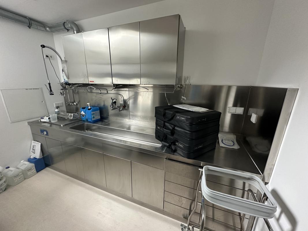 Stainless steel, L approx. 4,000 mm, integrated sink, shower head, 2 wall cabinets, each with 2 double doors, integrated sterilizer, Bandelin, Sonorex type