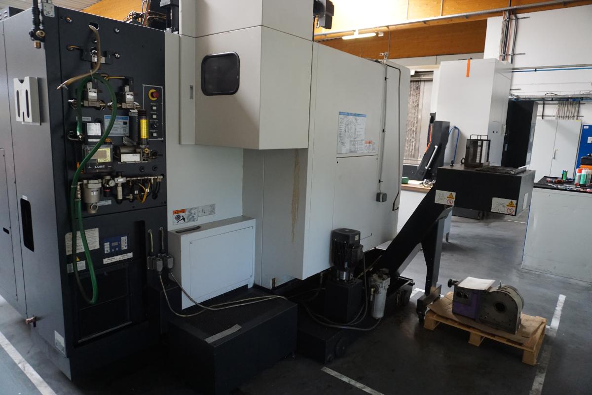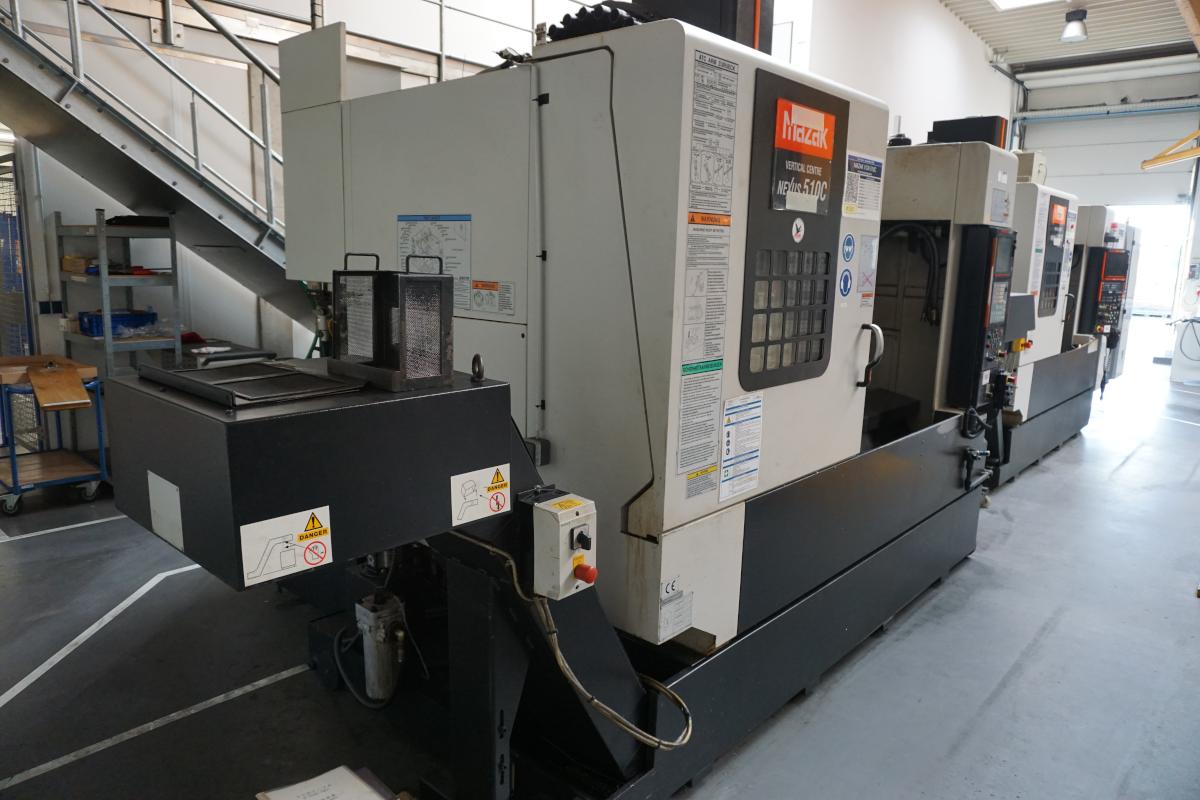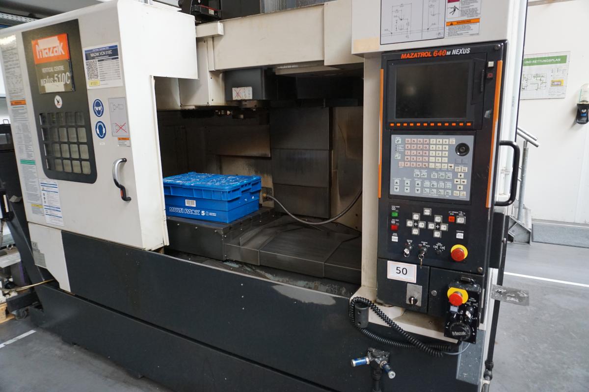 Make: MAZAK, Model: VCN 510C, Year of construction: 2004, Make: MAZAK, type: VCN 510C, year of manufacture 2004, serial no. 173160, Weight 7,100 kg, control, type Mazatrol 640M Nexus, travel distances X/Y/Z 560 x 410 x 510 mm, A-axis 360° (dismantled), max. speed 12,000 rpm, tool diameter 80 / 125 mm, tool holder SK40, tool length 350 mm, workpiece weight 1,200 kg, tool magazine, 30 places, coolant device, underfloor chip conveyor, operating hours 63,938
