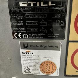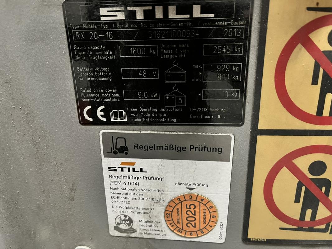 Make: STILL, Model: RX20-16, Year of construction: 2013, Serial no. S16211000934, max. load capacity 1,600 kg, max. lift height 4,620 mm, operating hours read 8,200, hydraulic side shift, triplex mast, charger