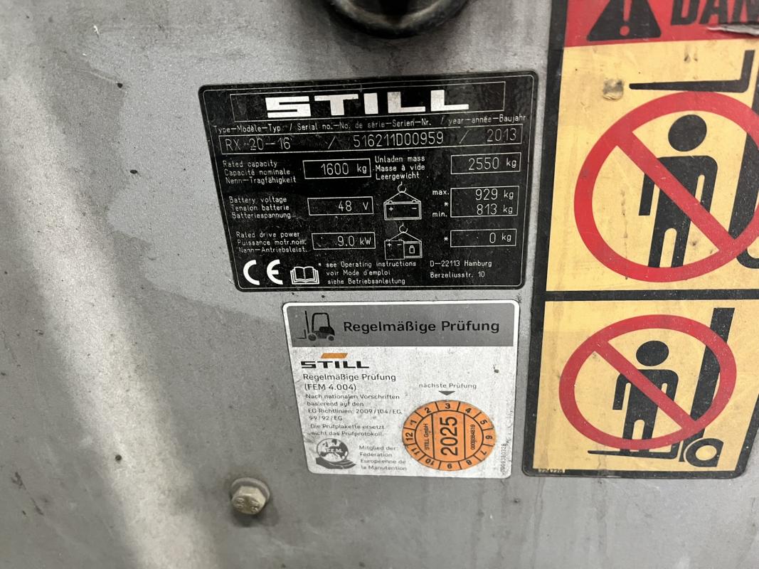Make: STILL, Model: RX20-16, Year of construction: 2013, Ser. no. 516211D00959, max. load capacity 1,600 kg, max. lift height 4,620 mm, operating hours read 8,800, hydraulic side shift, triplex mast, charger