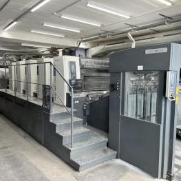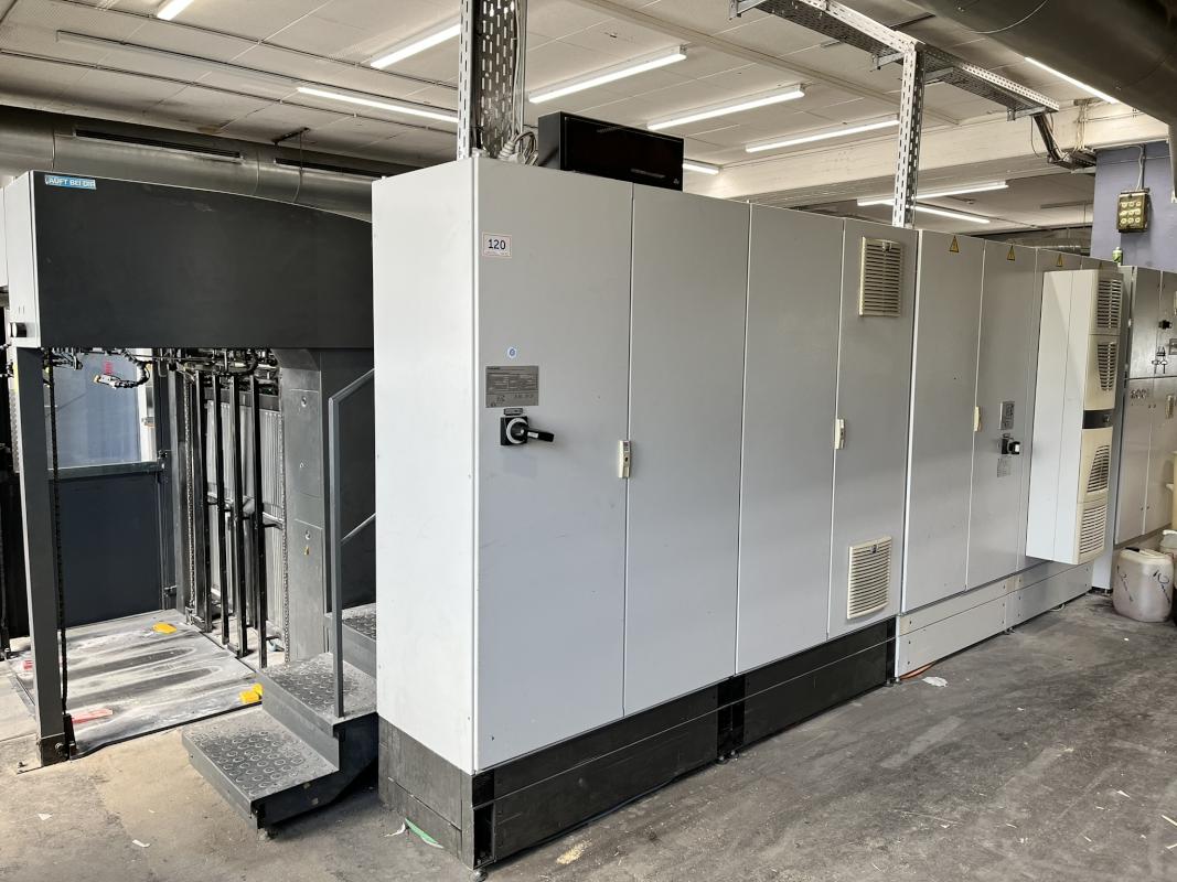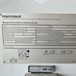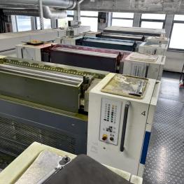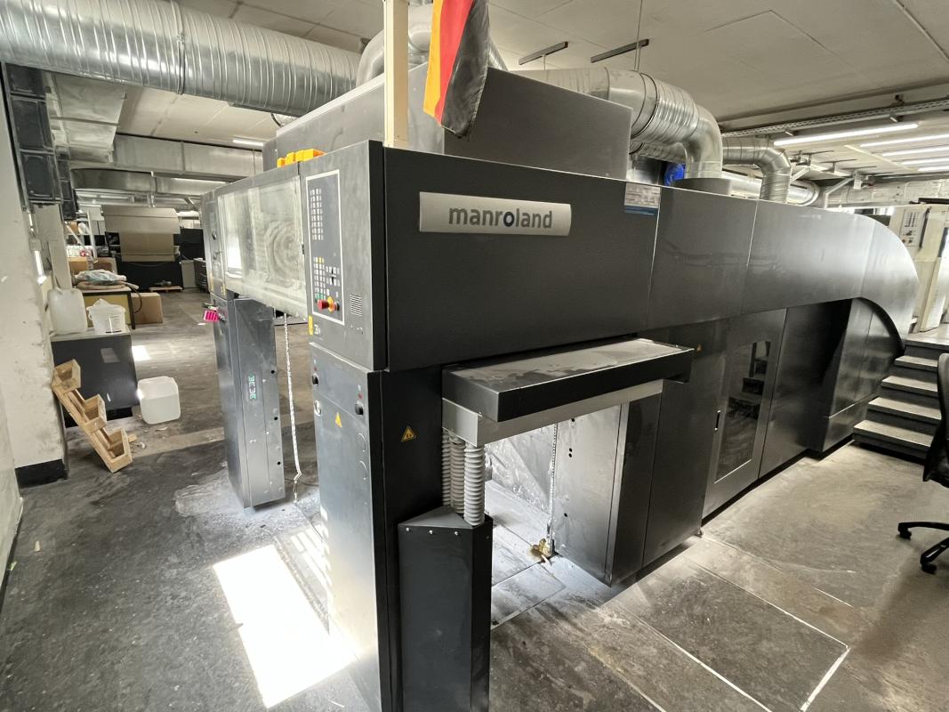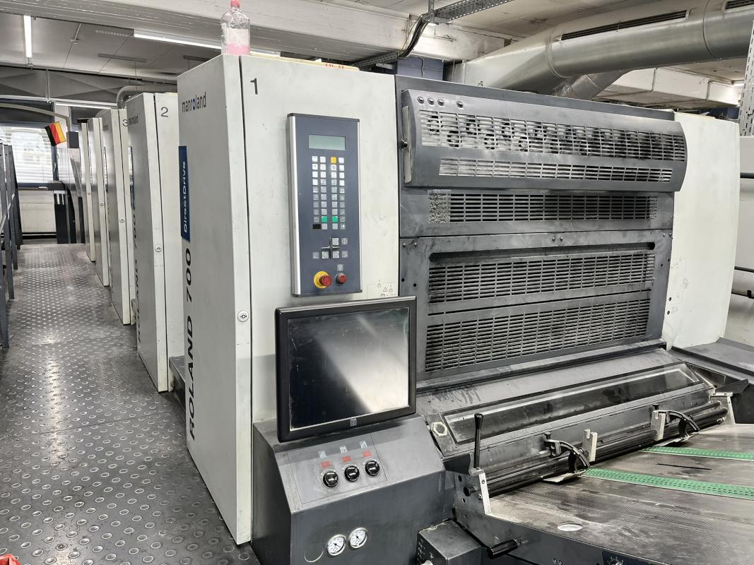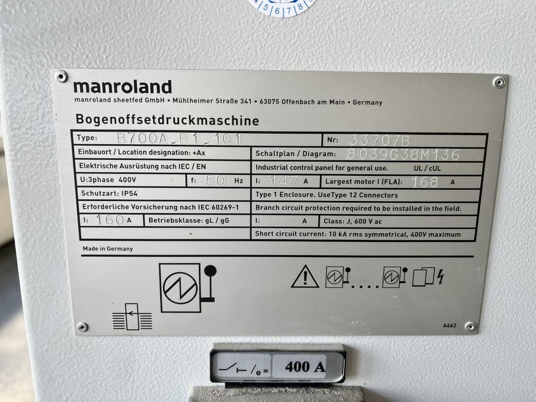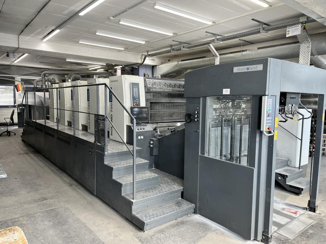 Make: MAN ROLAND, Model: R704 3B LV DirectDrive, Year of construction: 2012, Serial no. 33707B, sheet format 340-740 x 480-1,040 mm, max. printing area 715 x 1,020 mm, machine speed 18,000 sheets/hour, consisting of: High-performance shuttle feeder, ultrasonic double sheet control, film dampening unit with delta effect, 4 inking units, Roland RCI ink control, QuickChange Surface and QuickChange Wash, coating unit, SelectCleaning System blanket washing device, SelectDryer infrared dryer, plate cylinder with Roland 700 DirectDrive, printcom S blanket cylinder, Roland AirGlide high-stack delivery, Roland Select PowderSystem powdering system, PressPilot control station, reduced IPA, SelectAntistatic ionization system, sheet brake, semi-automatic non-stop operation in the delivery, QuickChange Air air control, QuickChange Color, beta.c combination device, Loogtech CMS Print B filter system, SelectCleaning printing cylinder washing device, Quickstart, InlineColorPilot color measurement and control system, standard light table, Fabr. Just, 5 flat cabinets with various documents, number of prints 328 million - as of 04/25